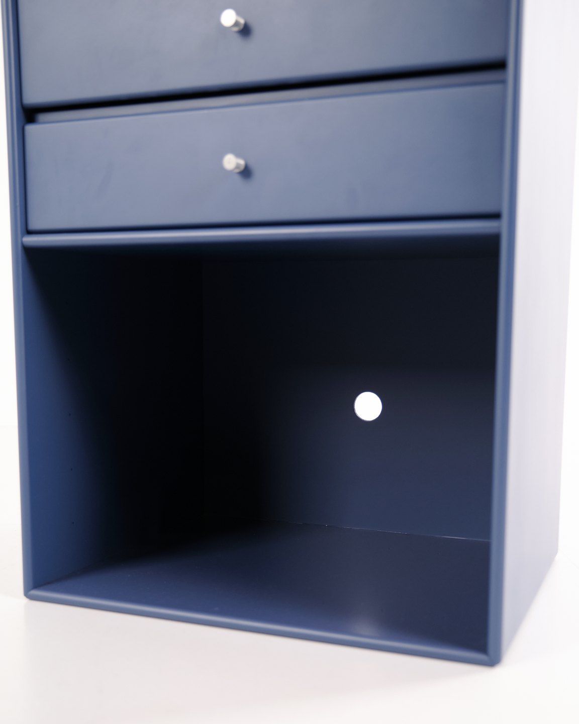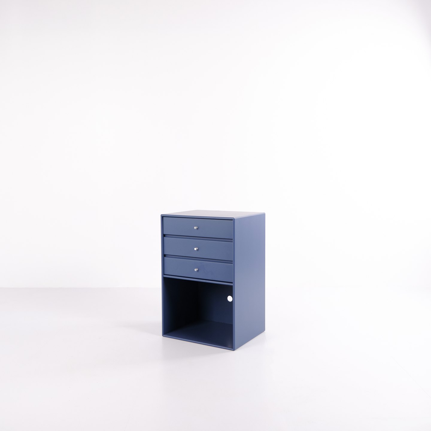 Montana reol i blå med krom ben. Indrettet med tre skuffer og én åben hylde, velegnet til både opbevaring og display. Et klassisk Montana-modul, der kombinerer funktionalitet og enkelt design.— Producent: Montana