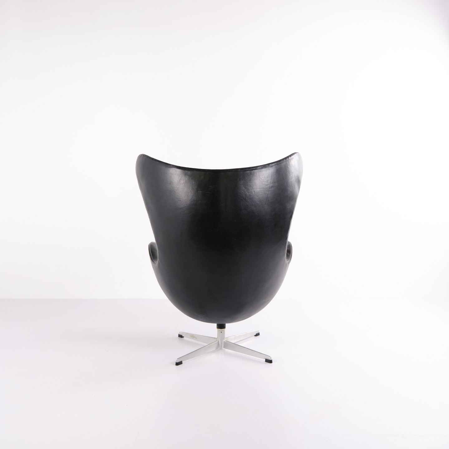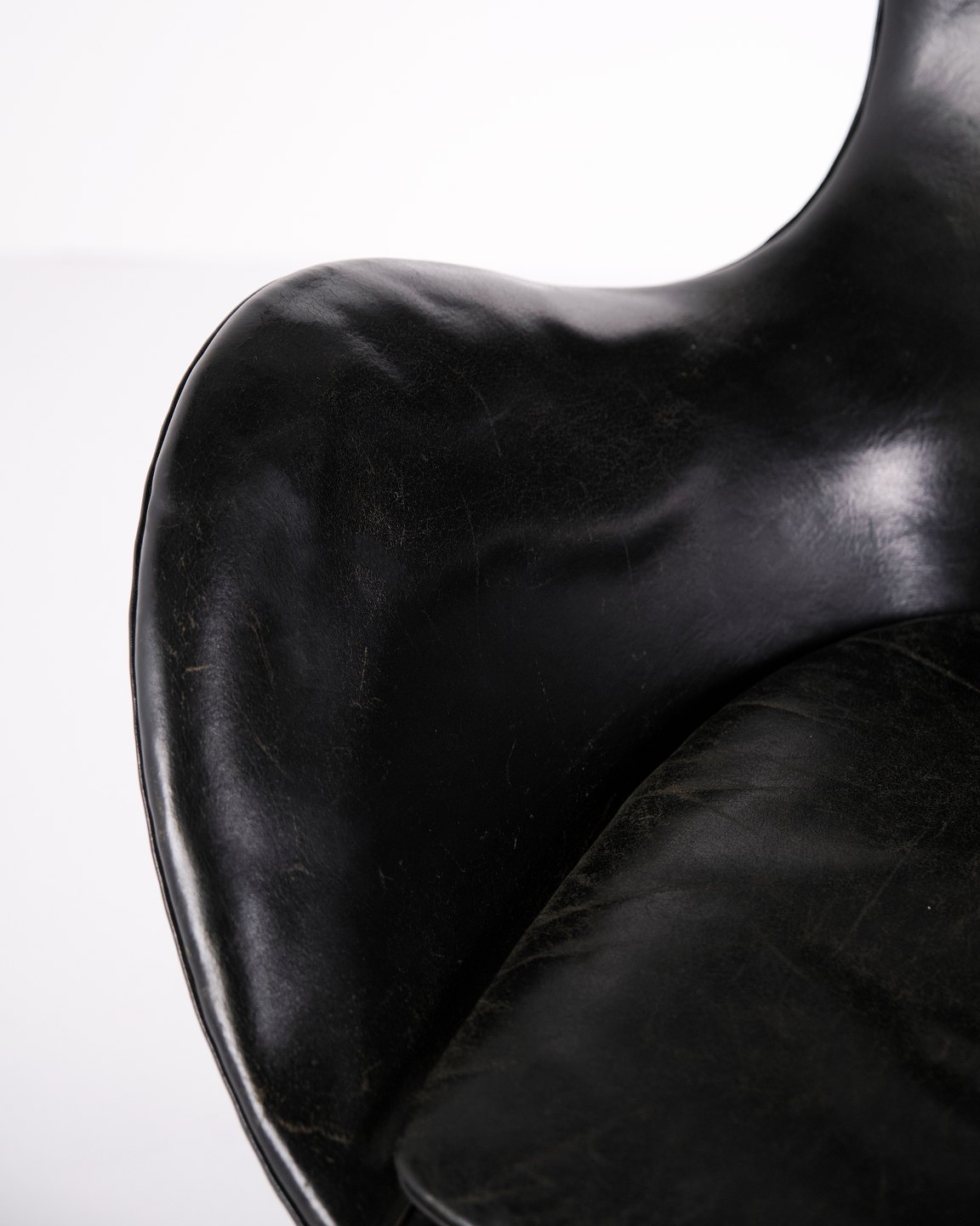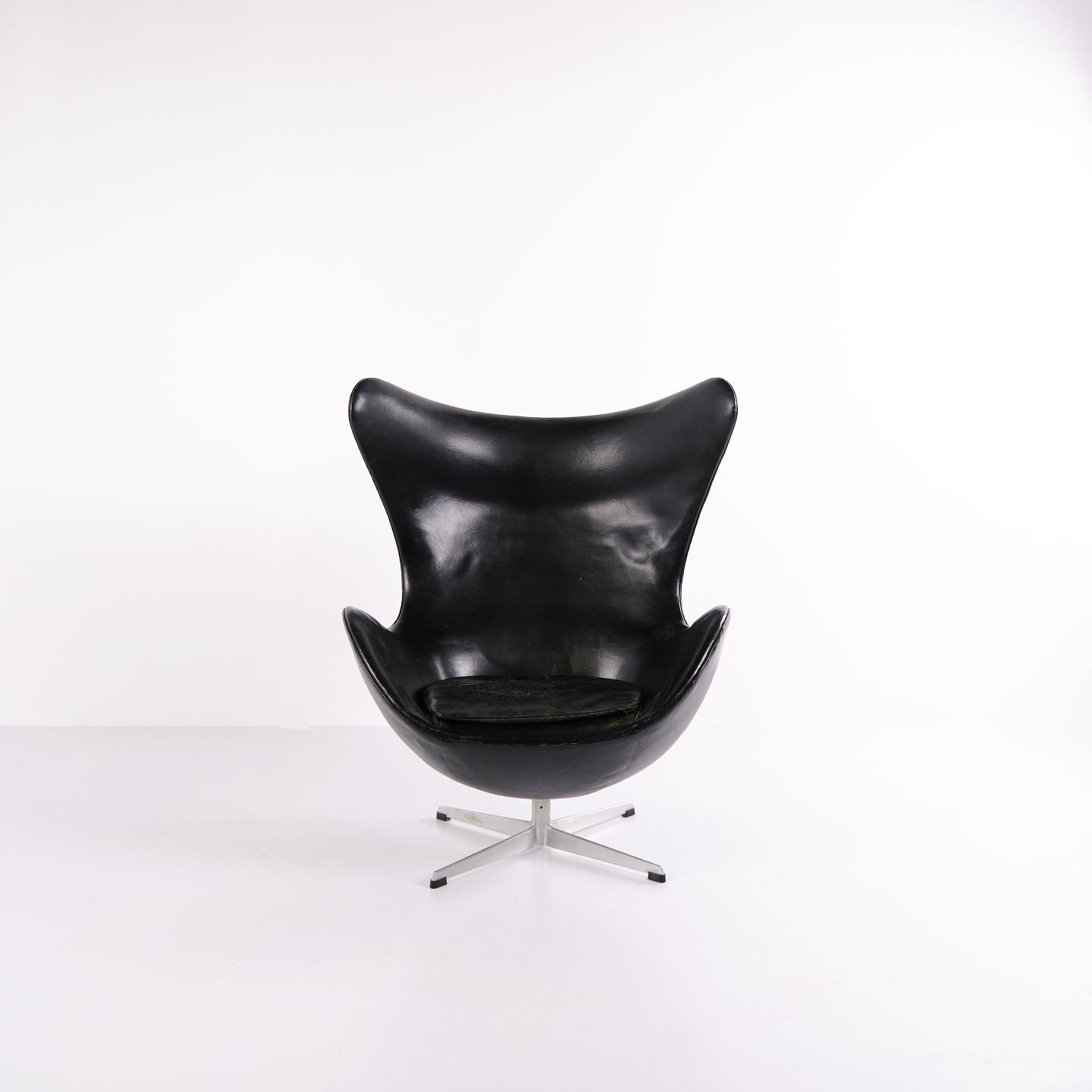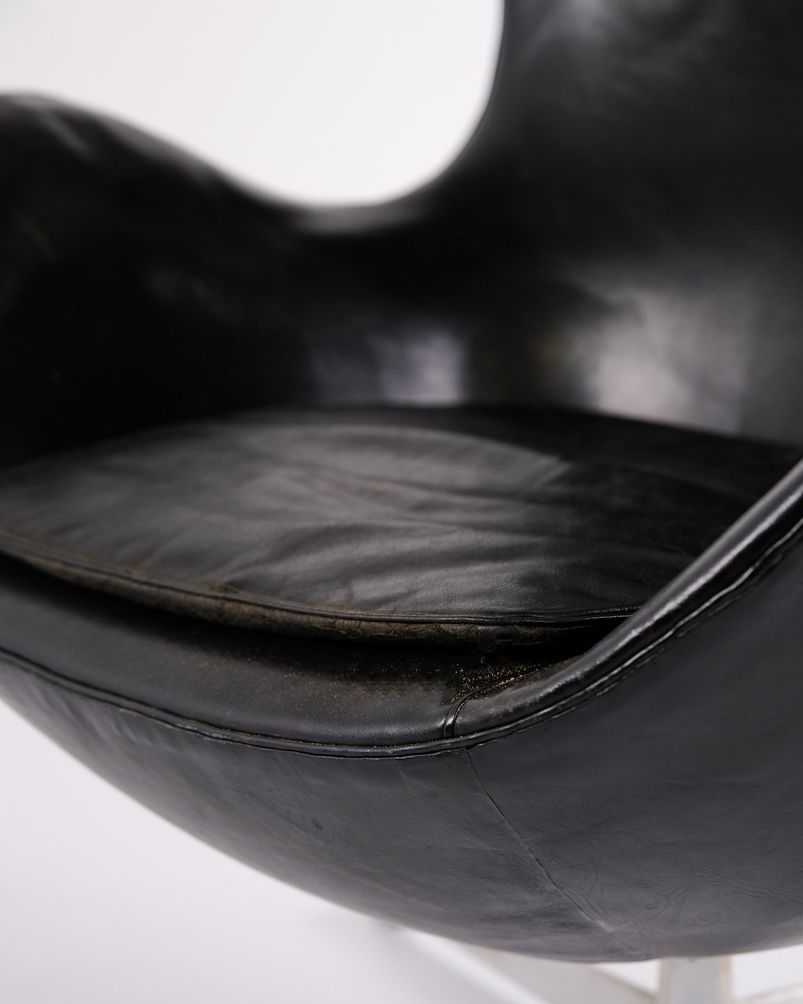 Ægget stol designet af Arne Jacobsen og produceret af Fritz Hansen. Ældre model, betrukket med sort original læder og monteret på aluminiumsfod. Et klassisk dansk designikon fra en tidligere produktionsperiode, hvor stolen blev udført med markante organiske kurver og en særlig dyb læderkvalitet.