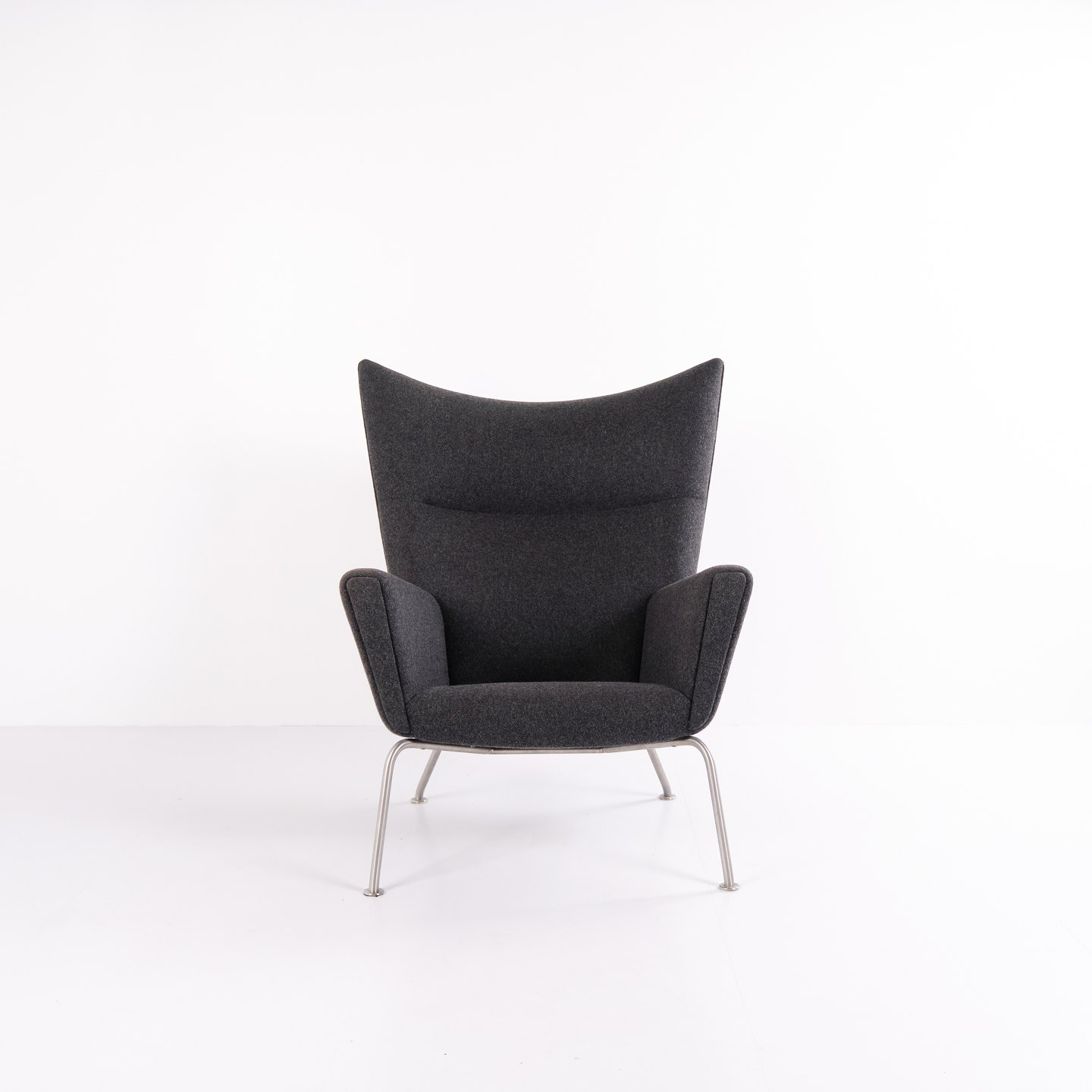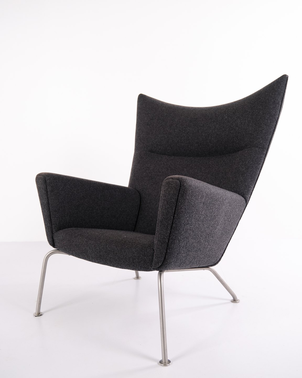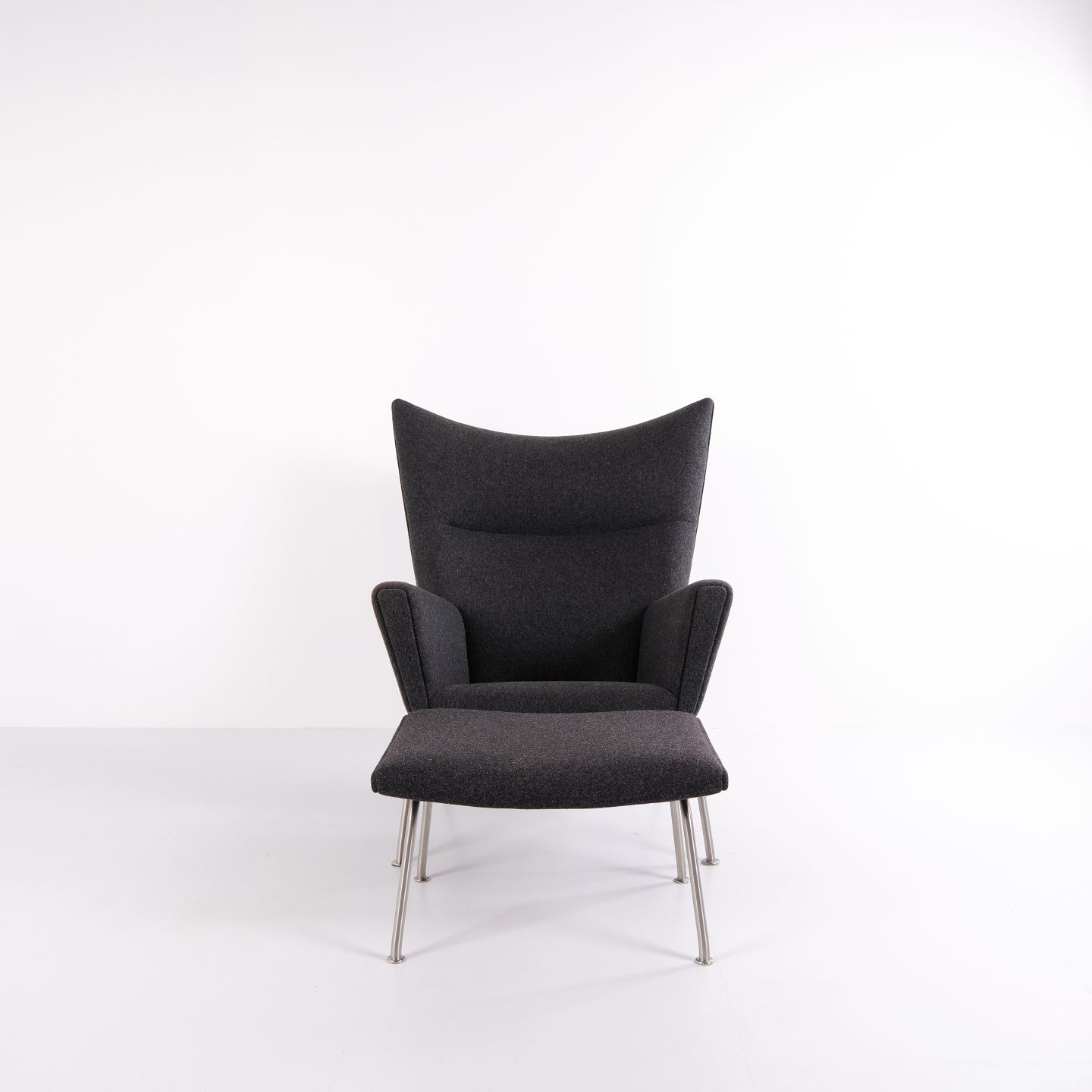 Wingchair CH445 designet af Hans J. Wegner og produceret af Carl Hansen & Søn. Udført i gråt Hallingdal-stof med tilhørende skammel i samme polstring. Klassisk Wegner-model med høj ryg, markante vinger og solid komfort. Et anerkendt dansk designikon.— Designer: Hans J. Wegner