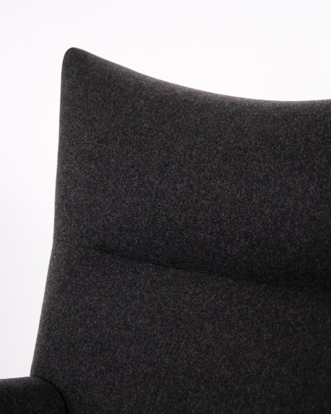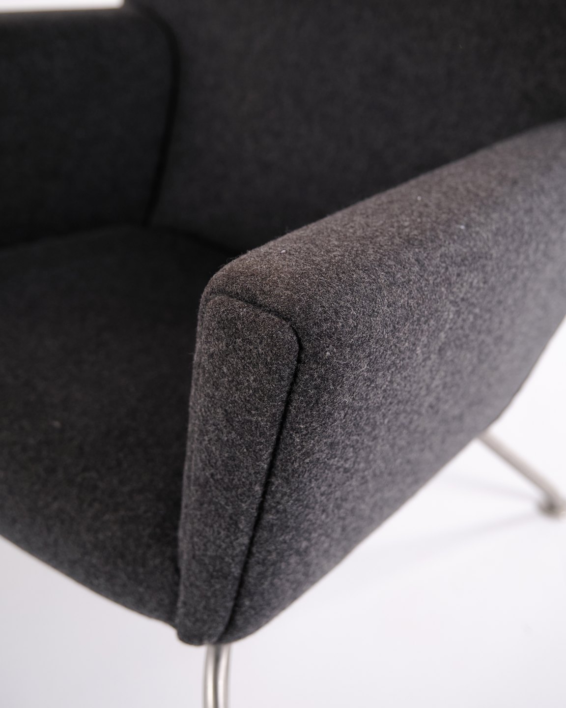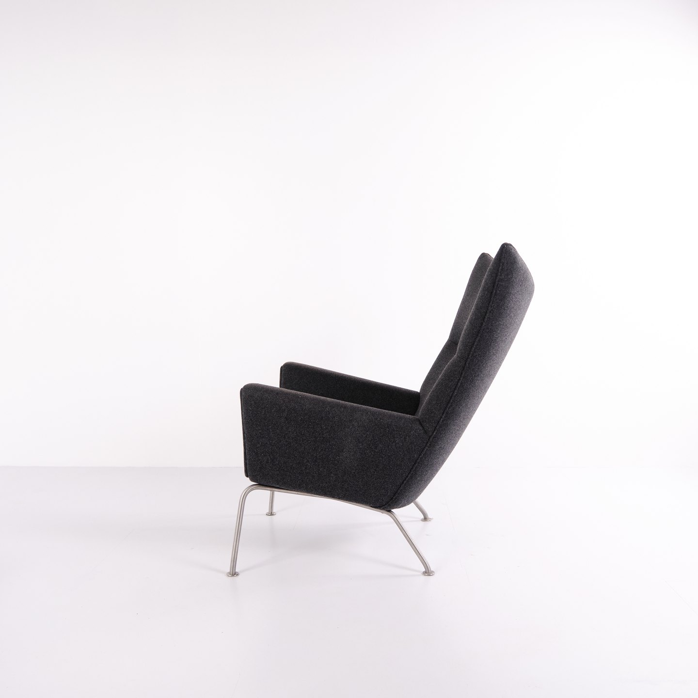 Wingchair CH445 designet af Hans J. Wegner og produceret af Carl Hansen & Søn. Udført i gråt Hallingdal-stof med tilhørende skammel i samme polstring. Klassisk Wegner-model med høj ryg, markante vinger og solid komfort. Et anerkendt dansk designikon.— Designer: Hans J. Wegner