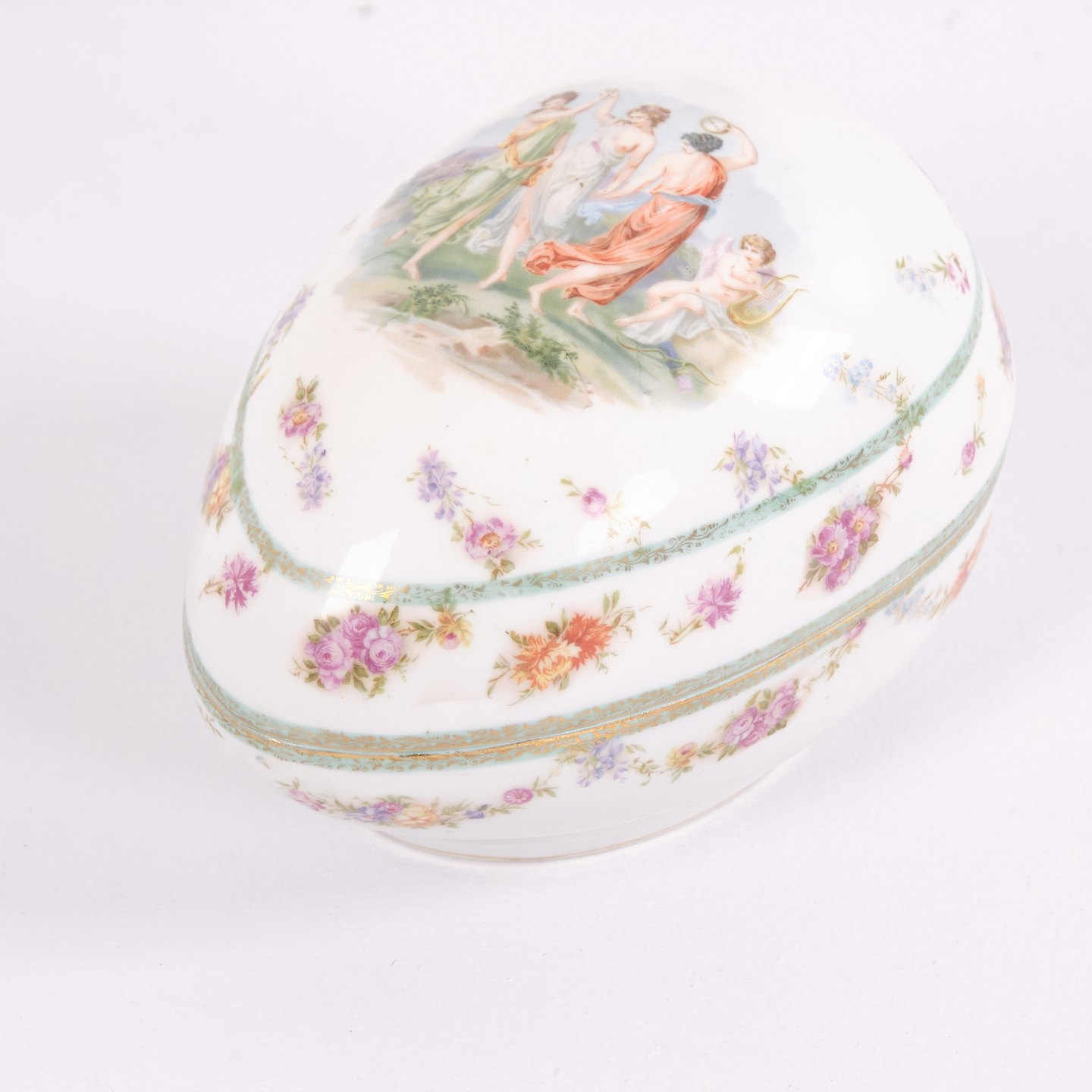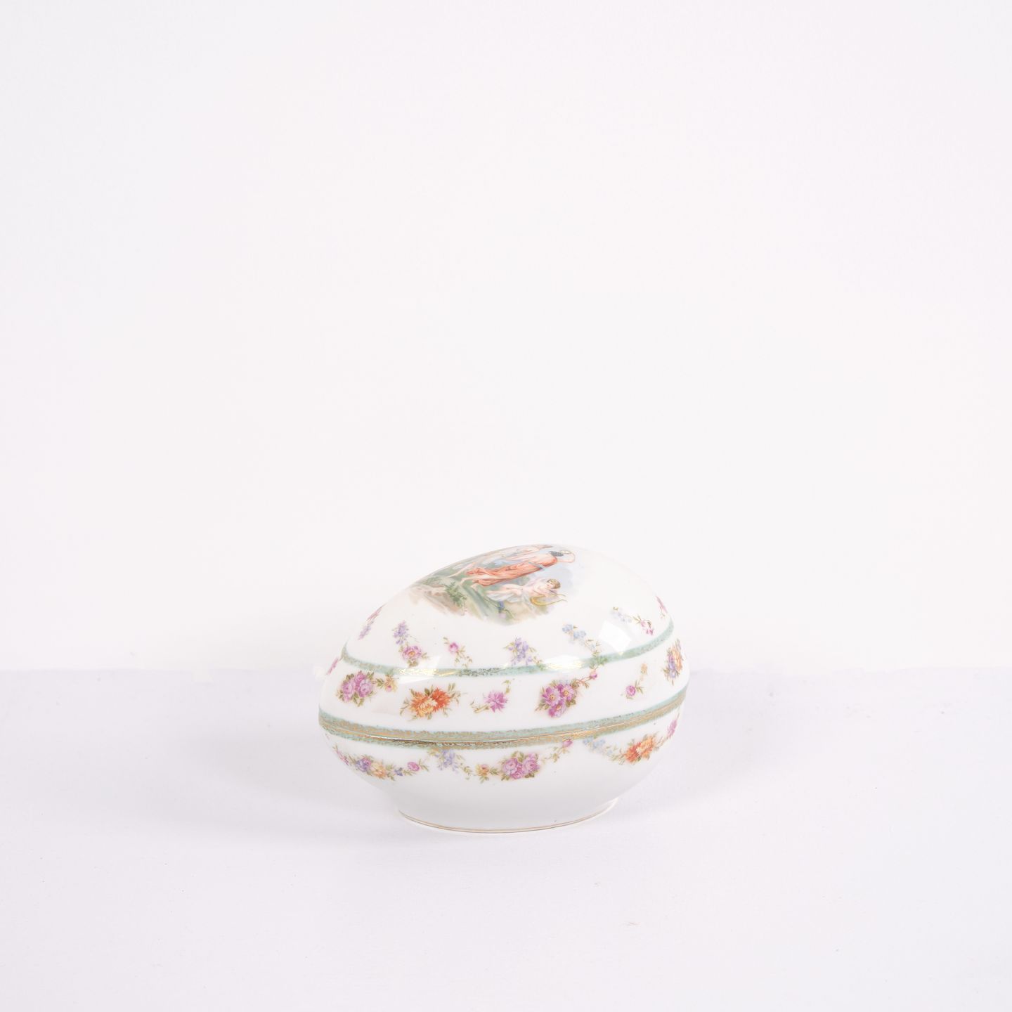 Fransk smykkeskrin fra 1890’erne med håndmalet motiv på låget og dekorative detaljer. Et elegant antikt skrin velegnet til opbevaring af smykker og små genstande.— Oprindelse: Frankrig