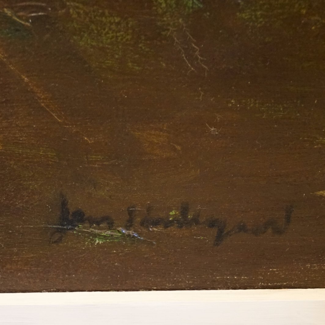 Jens Søndergaard; Landskabsmaleri med marker i forgrunden, samt tårn og hav i baggrunden. Olie på lærred.Signeret "Jens Søndergaard".