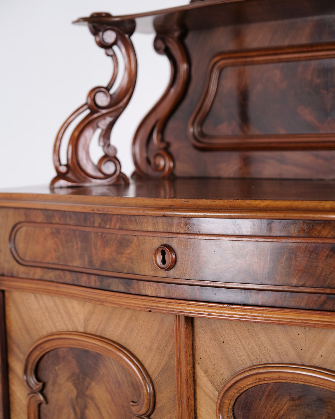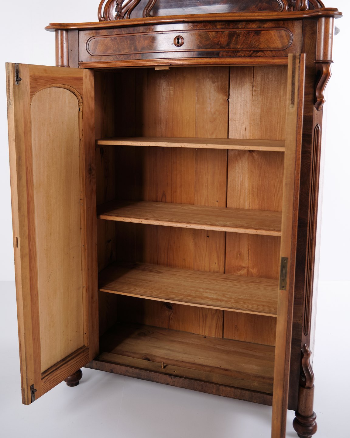 Antikt skab fra 1880’erne, udført i mahogni med dekorative udskæringer. Skabet har låger og indvendige hylder, velegnet til opbevaring i stue, entré eller spisestue.— Oprindelse: Europa