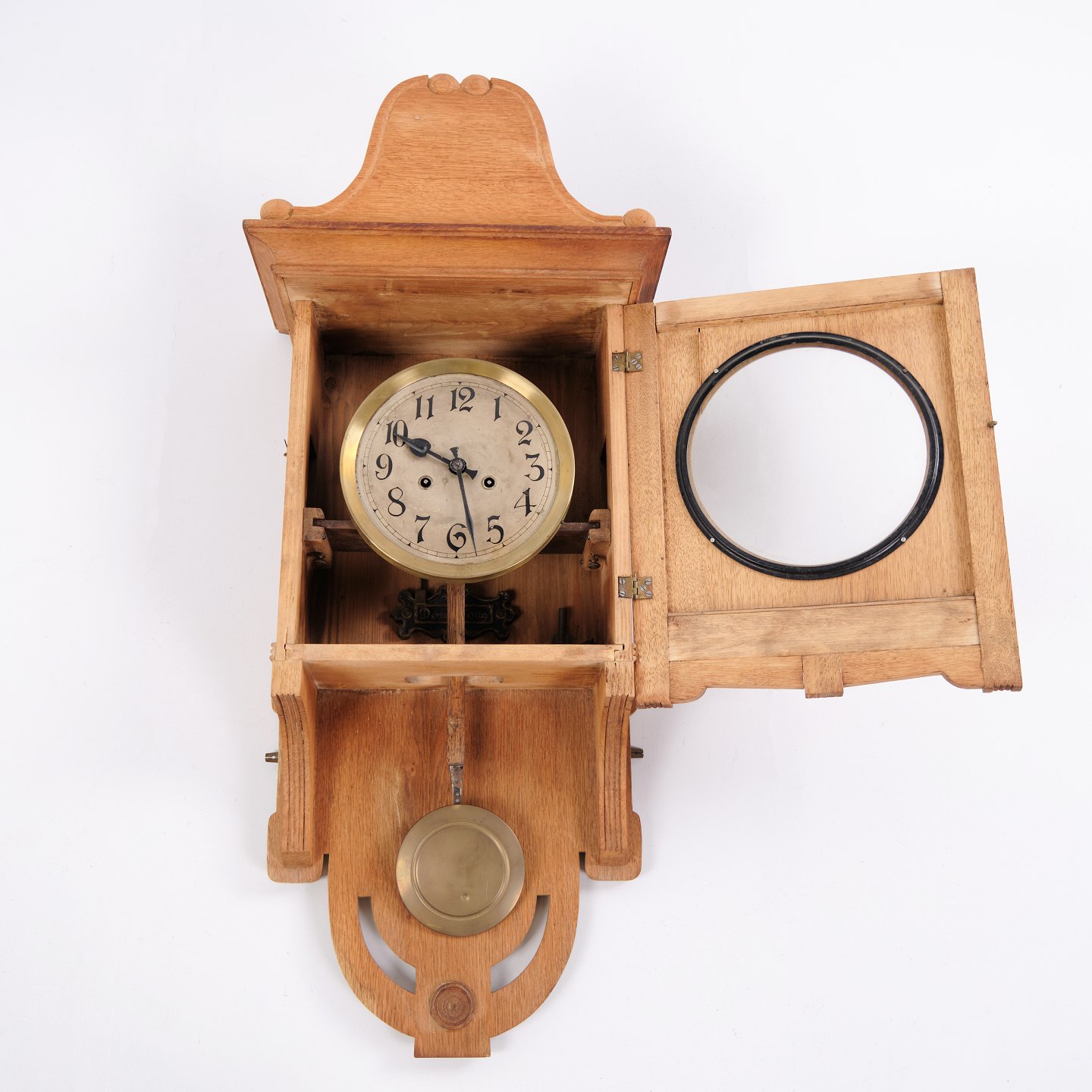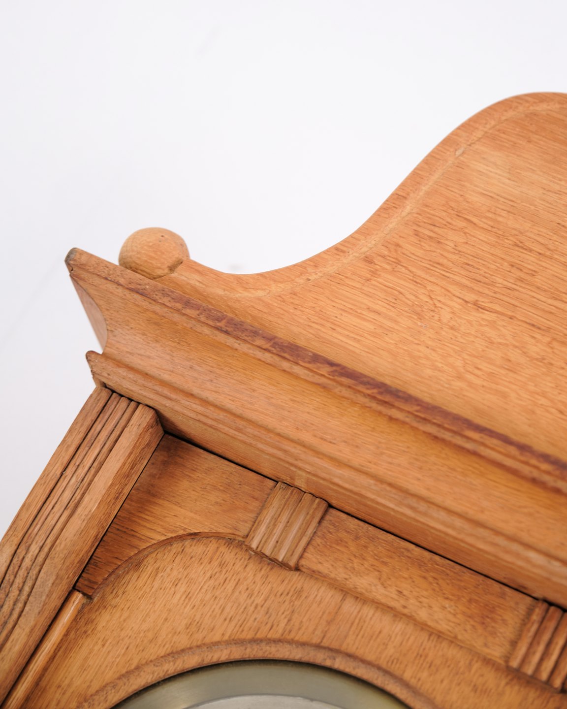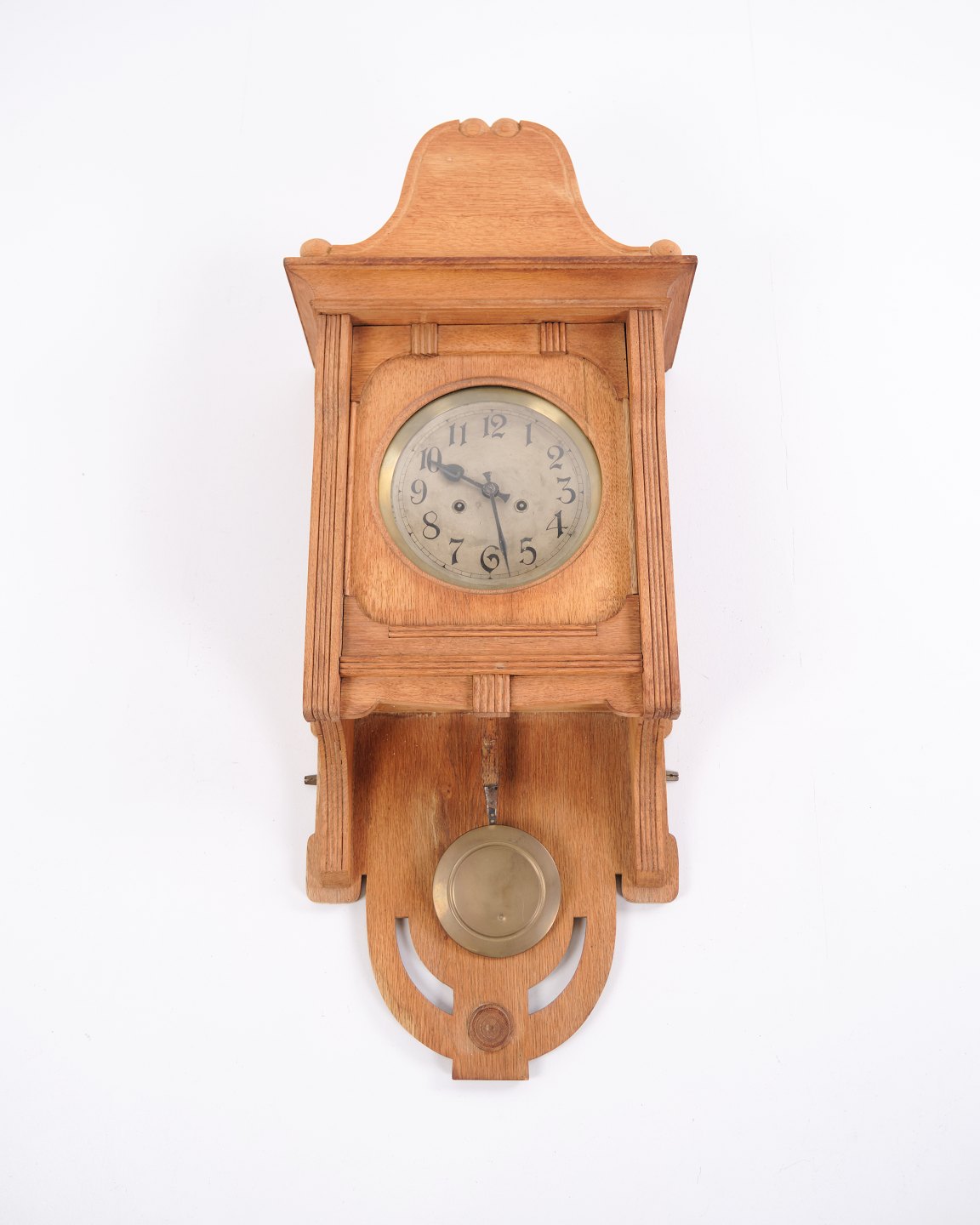 Vægur fra begyndelsen af 1930-tallet, udført i egetræ og designet i Jugendstilens karakteristiske organiske formsprog. Urkassen har elegante detaljer og en klassisk front, der understreger perioden og håndværket.— Oprindelse: Tyskland