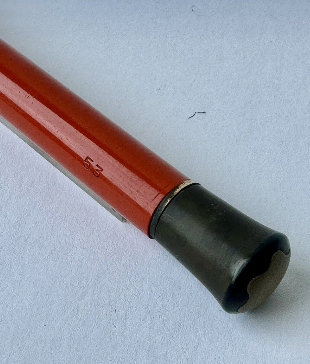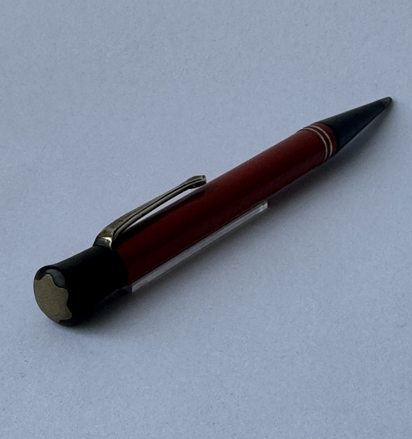 ART DECO PERIODEN: Koralrød Montblanc nr. 53 skrueblyant med stor indsat ben-hvid stjerne på toppen. Fremstillet i 1920’erne. Funktionsduelighed: Blyantsspidsen kan skrues ud, men skal have hjælp til at blive skruet tilbage. Skrues ikke naturligt tilbage når der drejes kontra på toppen. Indprentet Fabriksnavn MONTBLANC samt modelnummer 53. I god stand uden skader. Mål: 13,4 cm langv/ Jesper Reutemann