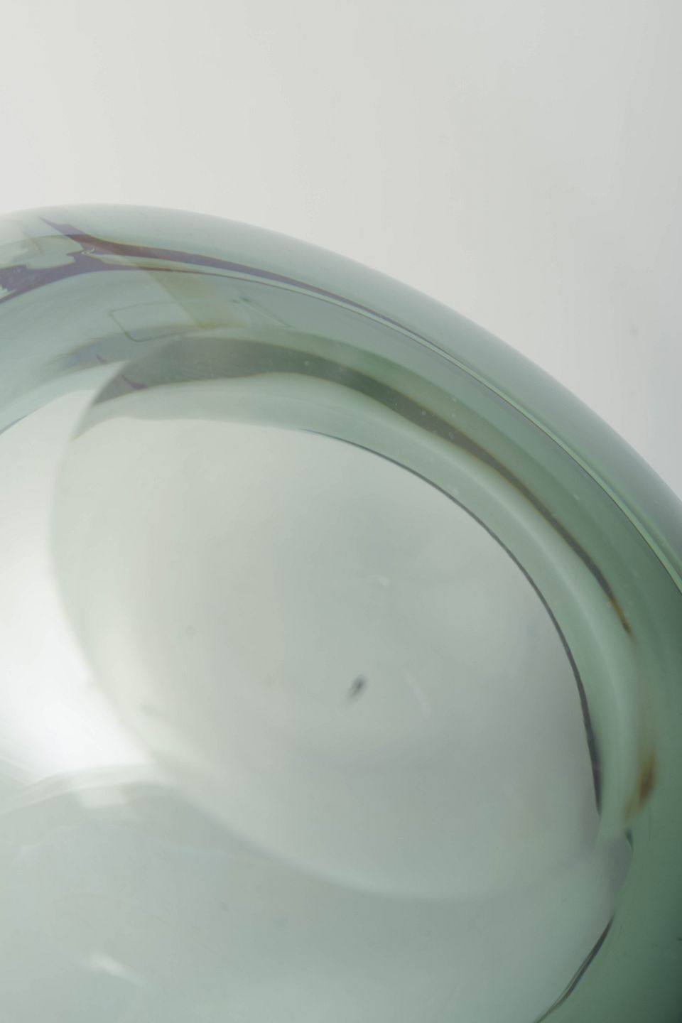 Organisk formet mundblæst skål i grønt glas med tykke vægge og blødt afrundet formgivning, typisk for skandinavisk glasdesign i perioden.