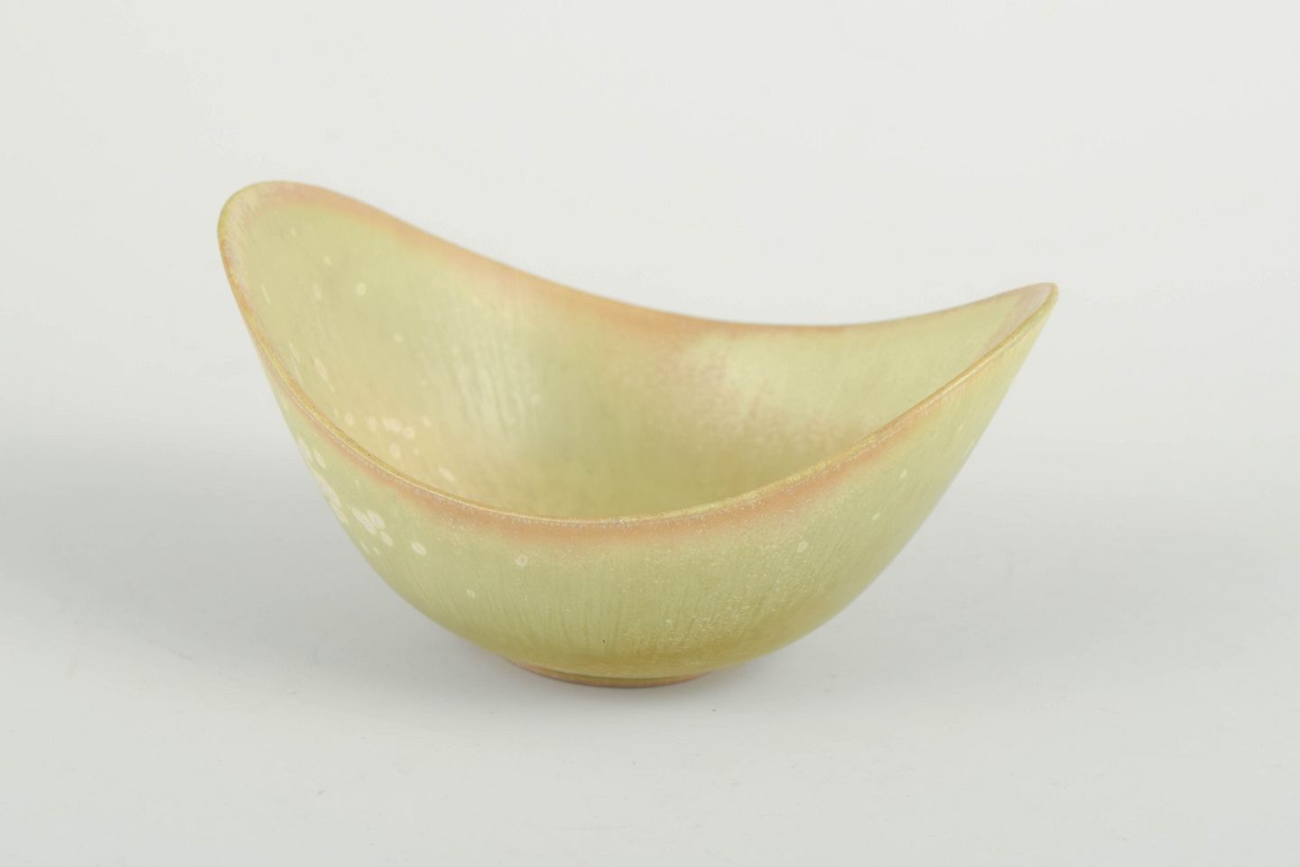 Elegant organisk formet skål i stentøj med den karakteristiske æggeskalsglasur i lyse grønne og rosa toner.