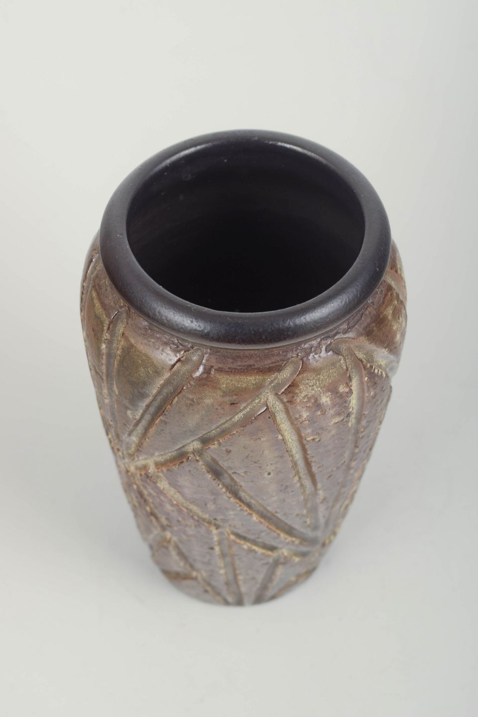 Reliefdekoreret vase i stentøj med markant indridset blad- og linjemønster samt mørk glasur langs kanten. Model 3063A.