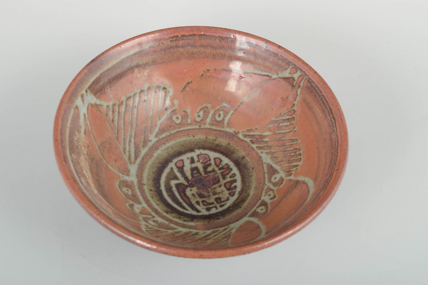Unik skål i kinesisk-inspireret stil med dekorativ relief- og penselmalet dekoration samt rødbrun glasur med lyse kontraster. Signeret.