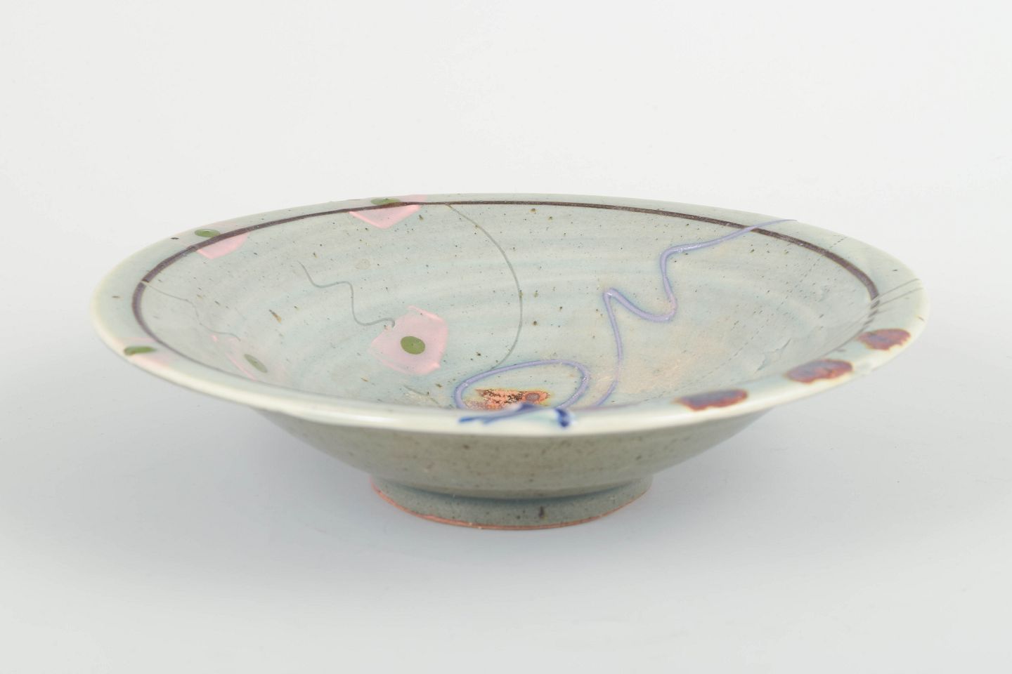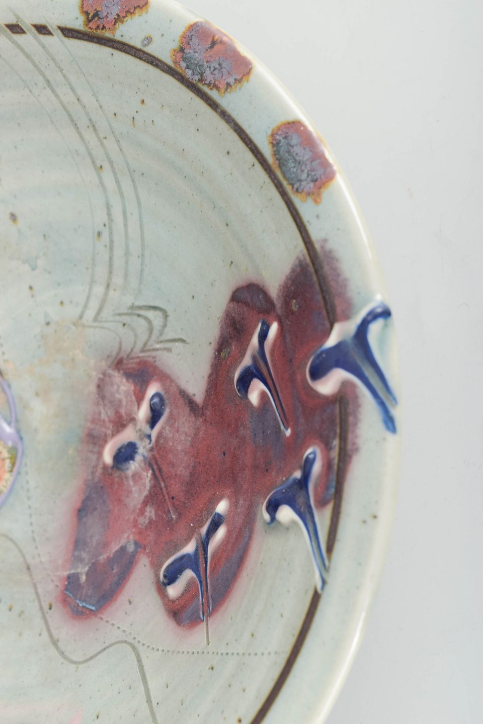 Unik skål i kinesisk-inspireret stil med dekorativ pensel- og reliefdekoration samt lys celadonlignende glasur med farvede detaljer. Signeret.