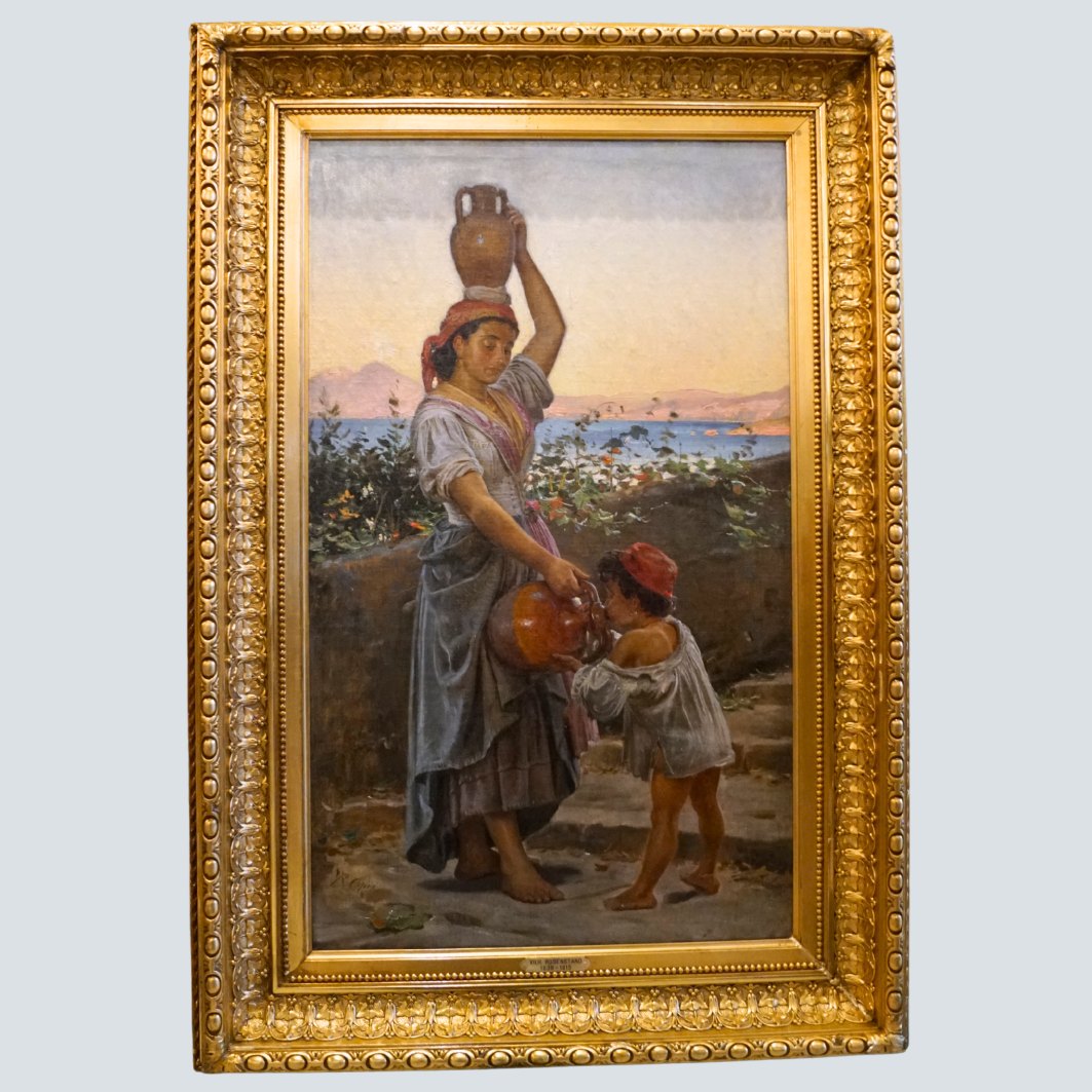 Vilhelm Rosenstand; Oliemaleri med kvinde og barn, motiv fra Italien. Olie på lærred. Signeret.