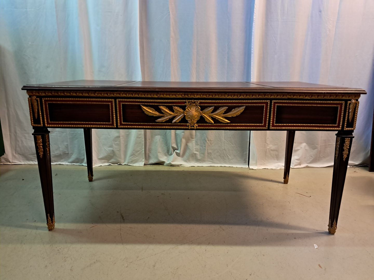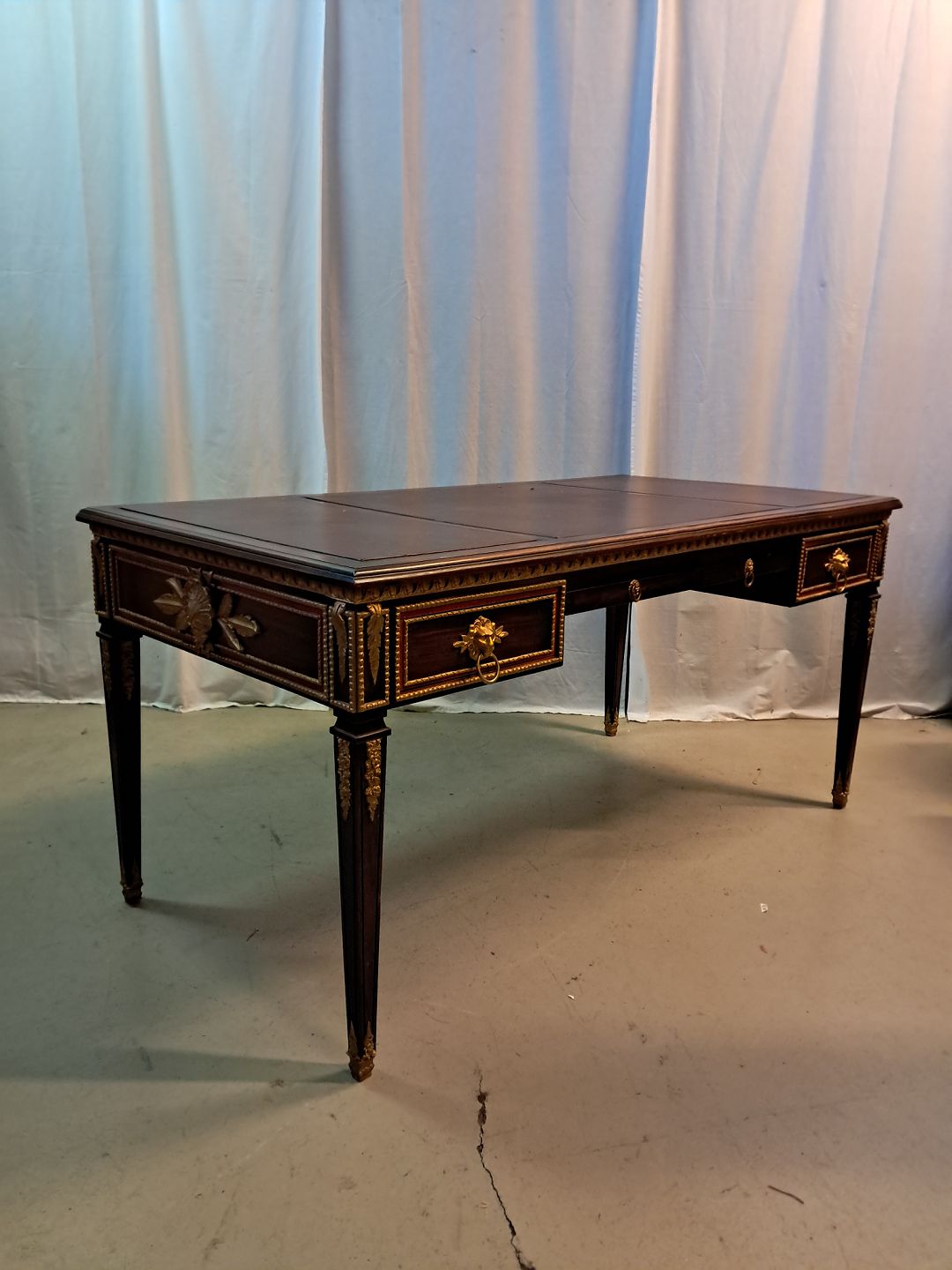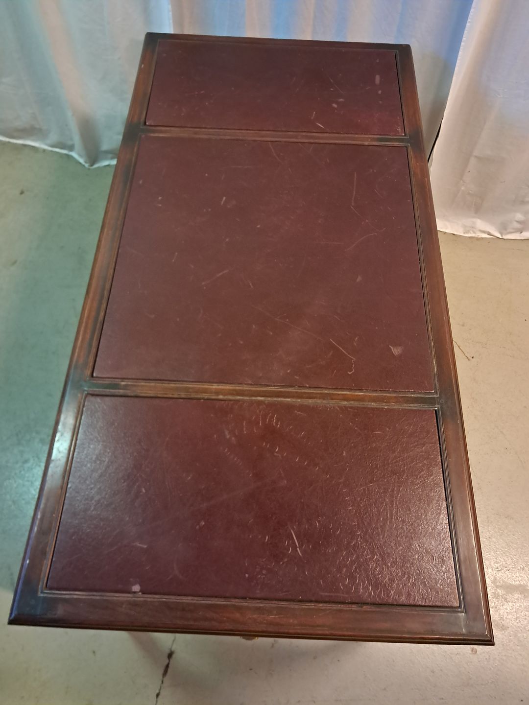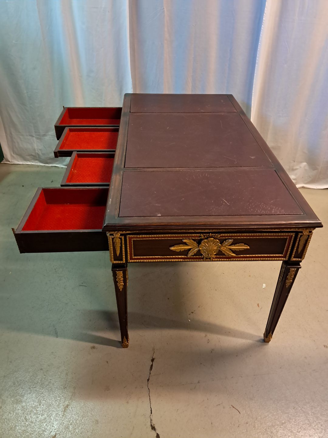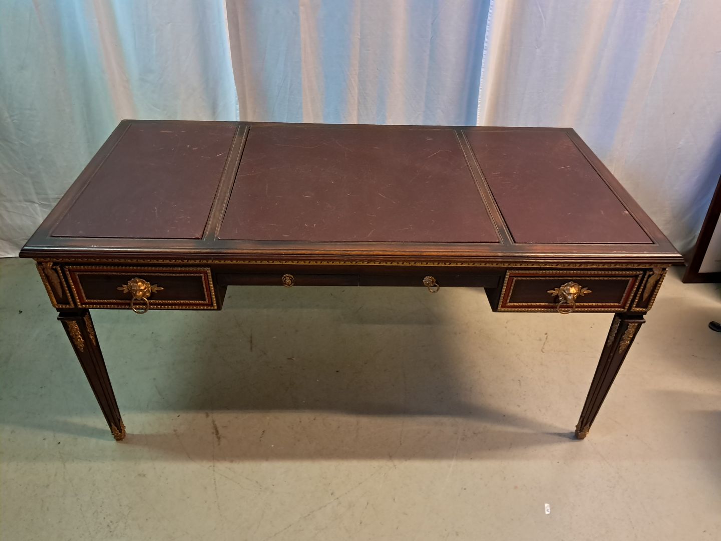 Skrivebord i fineret mahogni, fra 1990erne.Det har brugsspor.