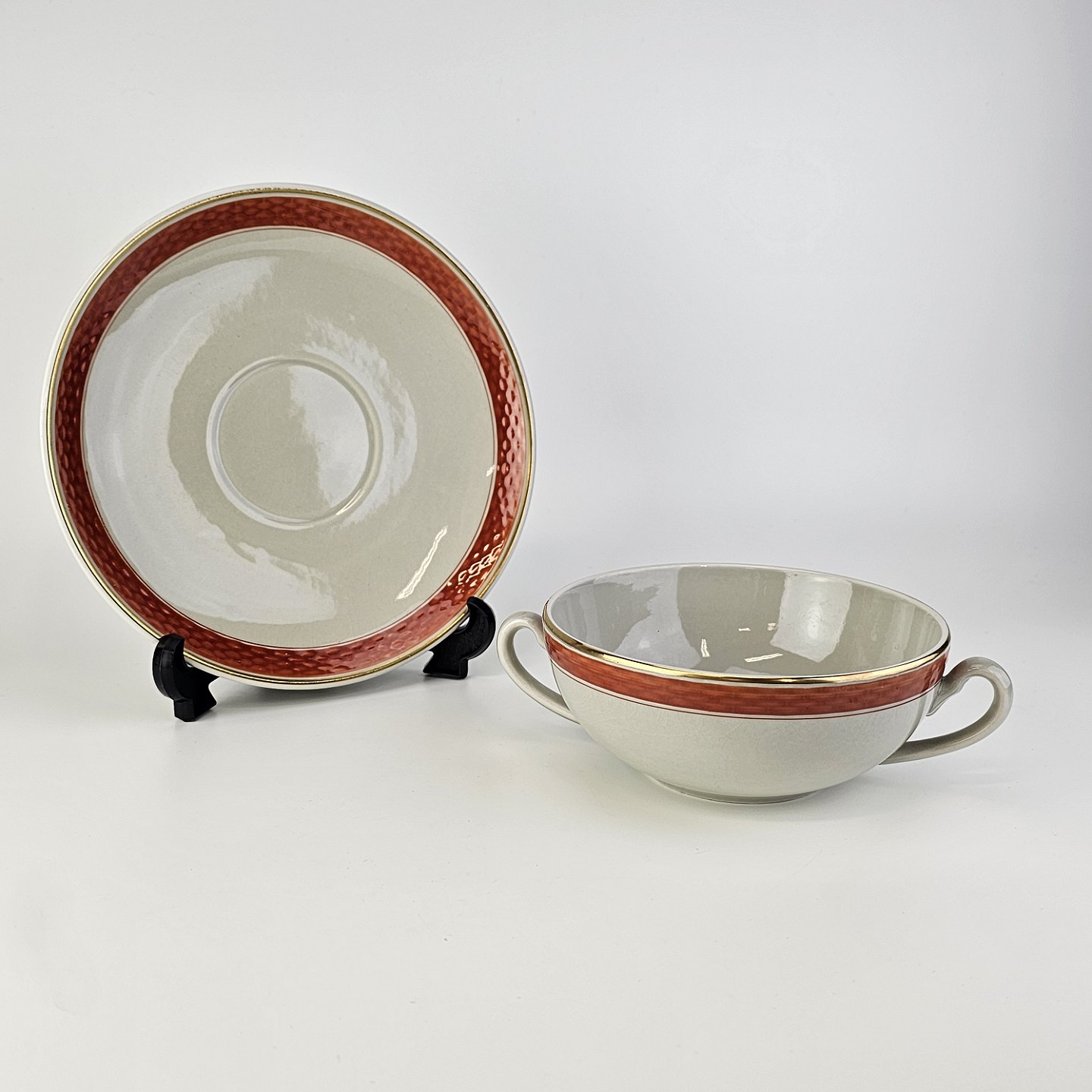 Tureby er stel i fajance dekoreret med rødt bånd og guldkant