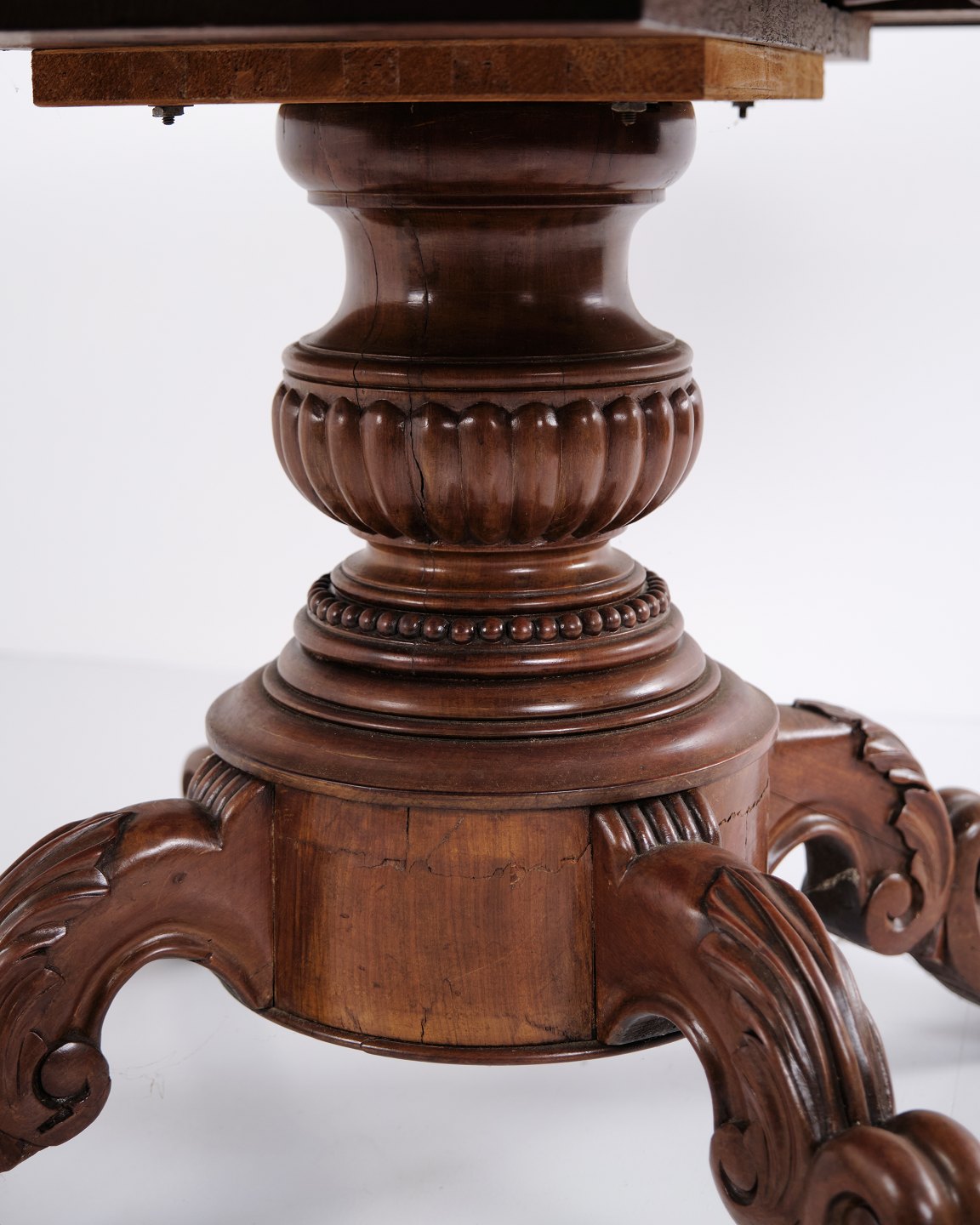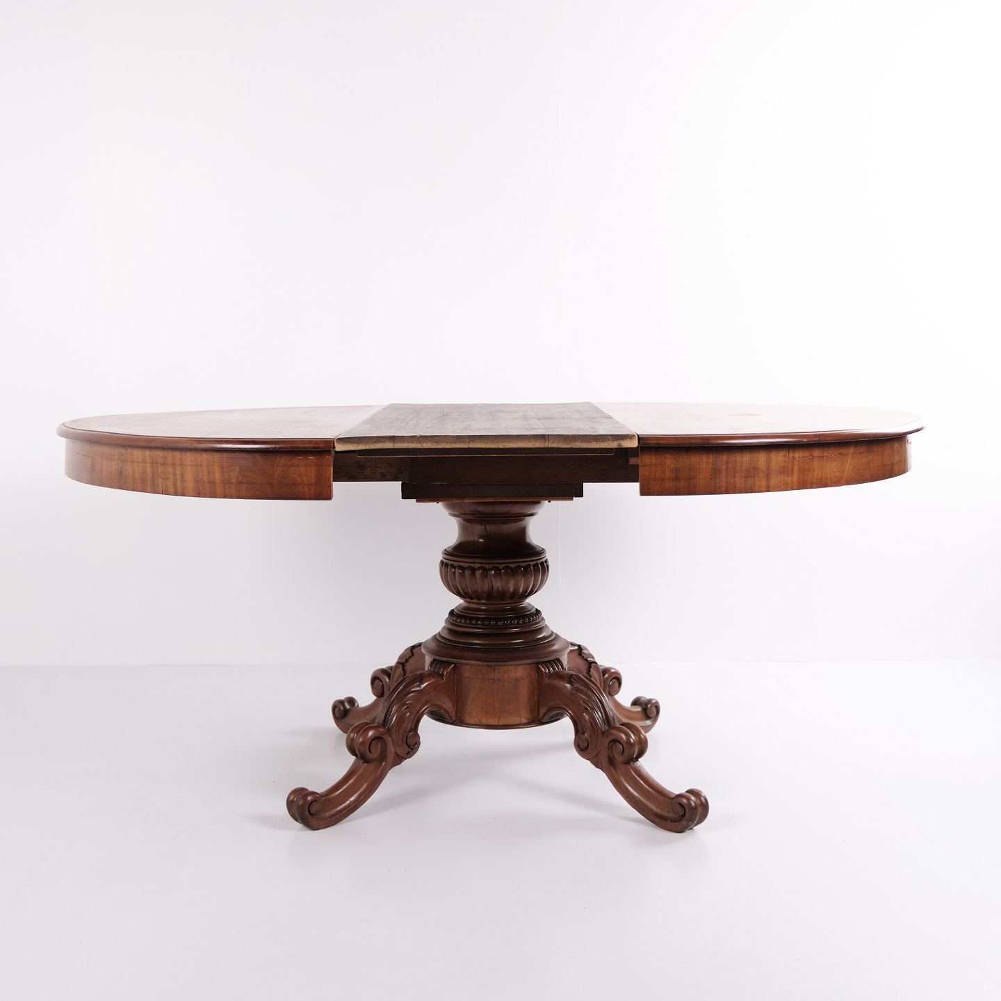 Søjlebord i sen Empire stil fra ca. 1840’erne, udført i mahogni med rige udskæringer og klassisk formsprog. Bordet kan udvides med fire tillægsplader og fungerer både som spisebord og dekorativt møbel i større rum.— Periode: Ca. 1840’erne