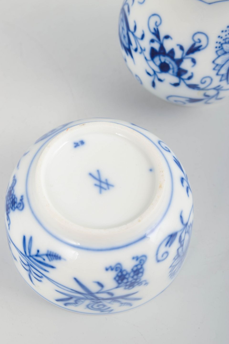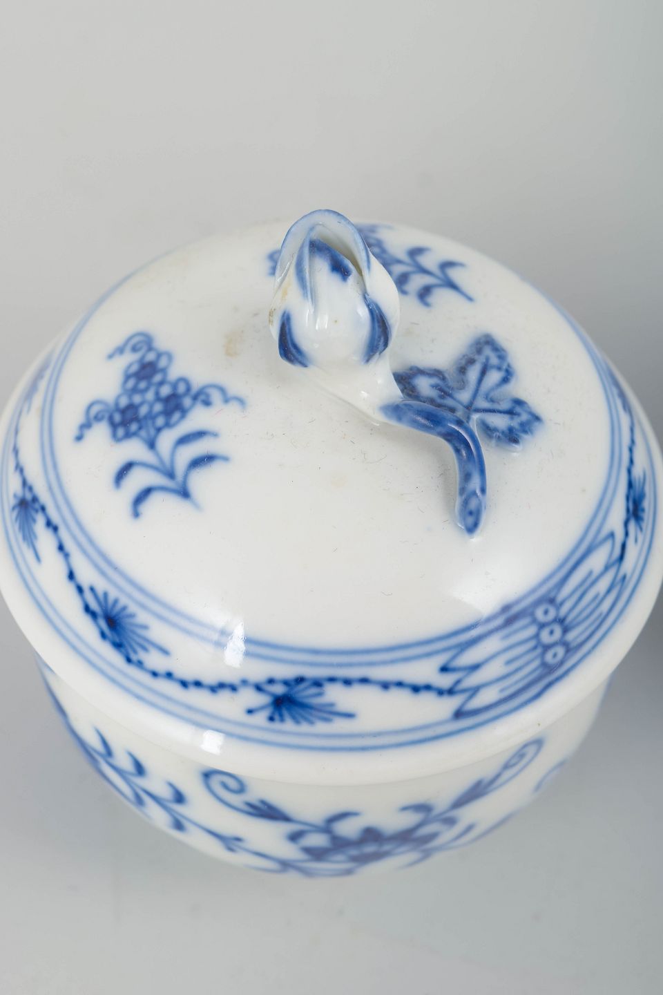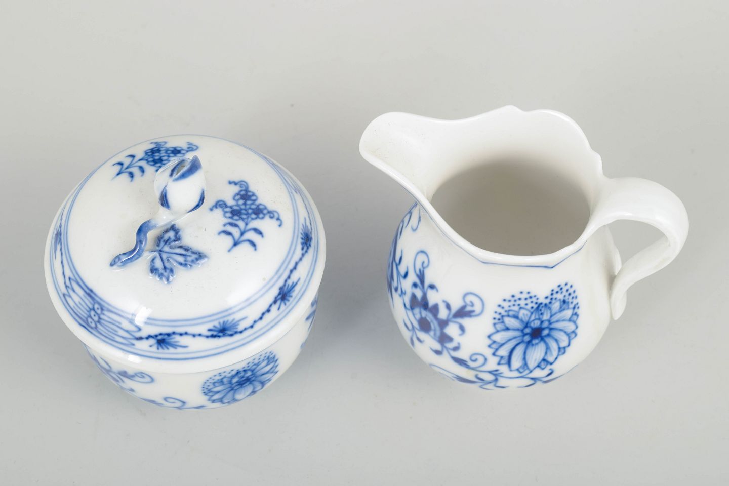 Meissen løgmønstret sukkerskål og flødekande, midt 1900-tal.Et charmerende sæt bestående af en klassisk sukkerskål med låg samt en flødekande i det ikoniske løgmønstret (Zwiebelmuster). Begge dele er håndmalet i koboltblå underglasur og udført i de elegante former, der kendetegner Meissens tidlige 1900-tals produktion.
