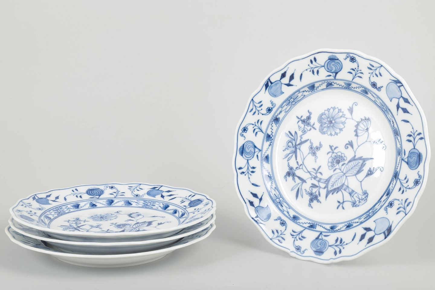 Fire klassiske Meissen tallerkener i det ikoniske løgmønstret med bølget kant og håndmalet blå underglasurdekoration. Et tidligt 20.-århundredes sæt i fin kvalitet.