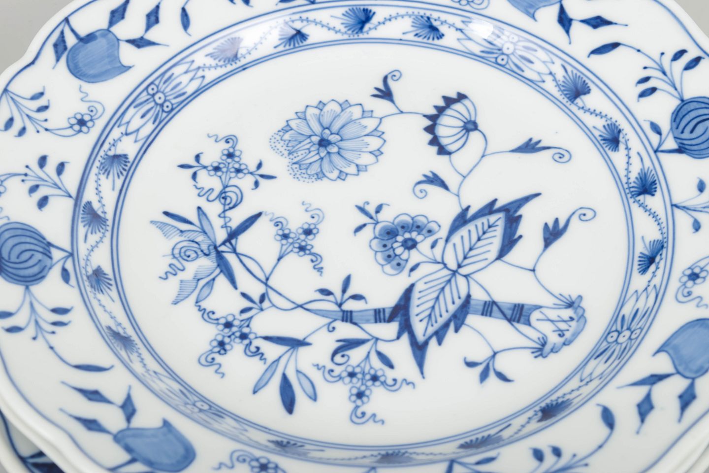 Meissens Zwiebelmuster blev introduceret i 1730’erne og er et af verdens mest kendte porcelænsdesigns. Dekorationen er håndmalet i koboltblå underglasur og har været i kontinuerlig produktion i snart 300 år. De tidlige 1900-tals eksemplarer er særligt værdsatte for deres håndværksmæssige kvalitet og skarpe maleri.