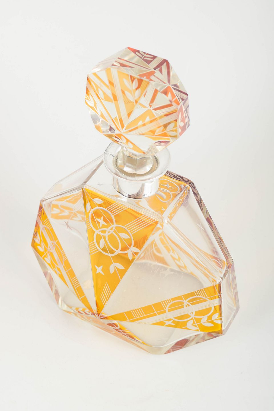 Svensk Art Deco karaffel i krystalglas med sølvmontre, 1920/30’erne.Facetteret Art Deco-karaffel i slebet og dekoreret krystalglas med orange/guldtonet krystalglasur og geometriske ornamenter. Original facetteret prop og sølvmontering.