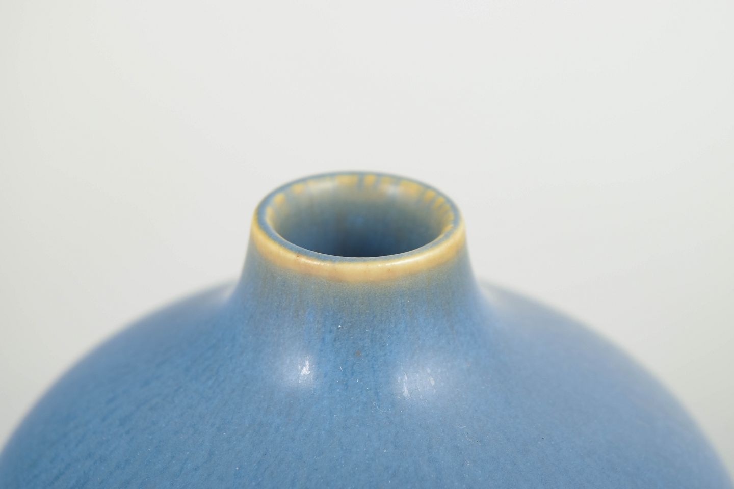 Smuk, lille stentøjsvase i klassisk afrundet form med silkemat lyseblå glasur og diskret nuanceret overflade. Typisk for Per Linnemann-Schmidts elegante, rene formsprog.