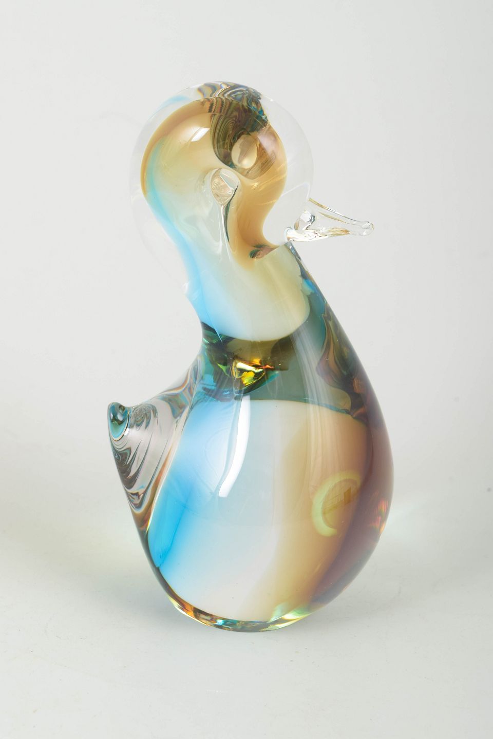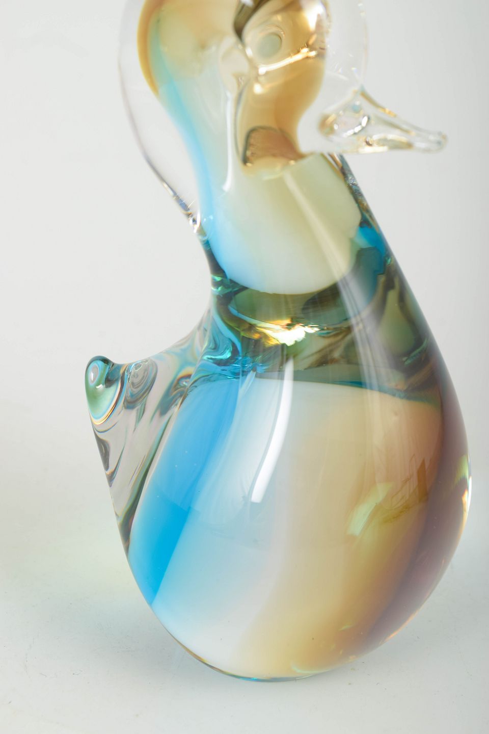 Håndformet svensk kunstglas-and fra Ronneby Glasbruk, udført i flerfarvet sommerso-teknik med bløde organiske linjer og klart glashoved. Et charmerende og klassisk eksempel på 1970’ernes dekorative glasarbejder.
