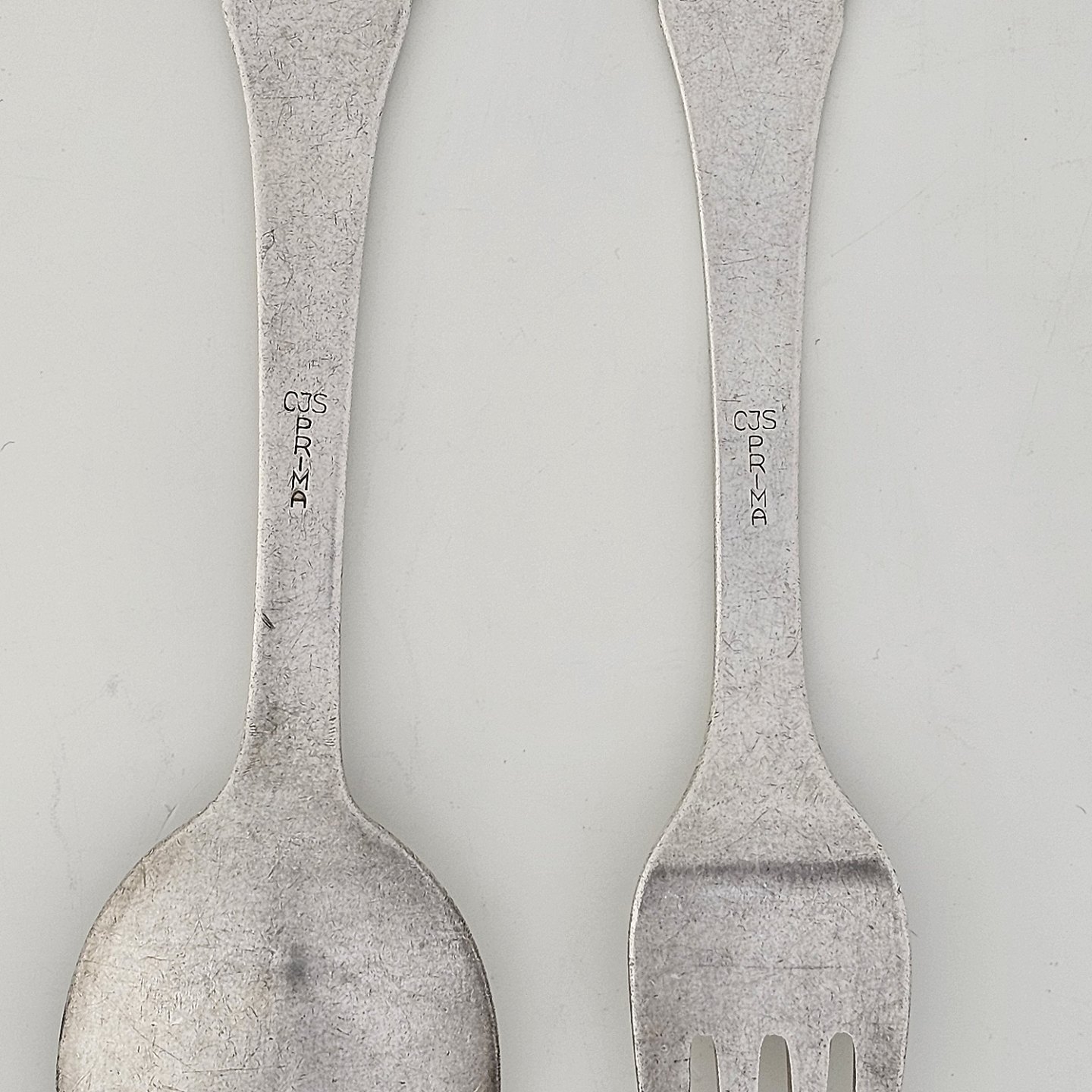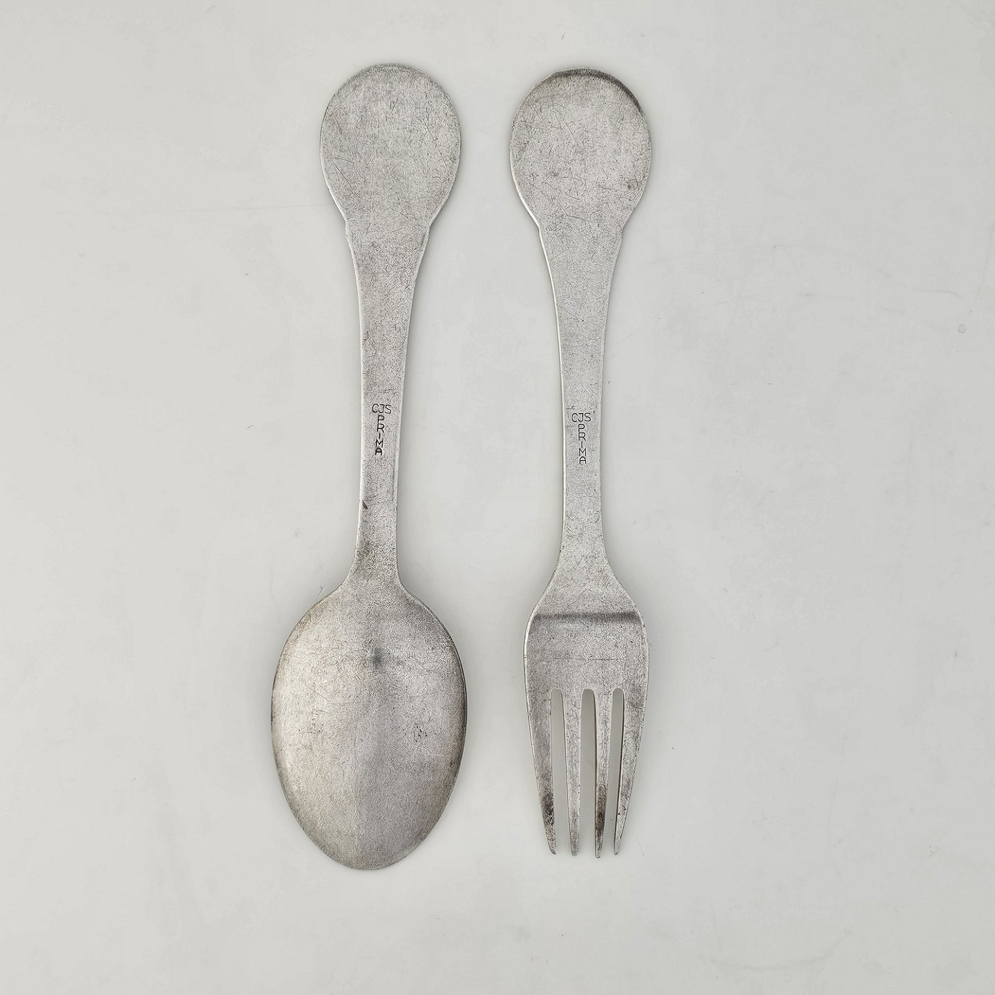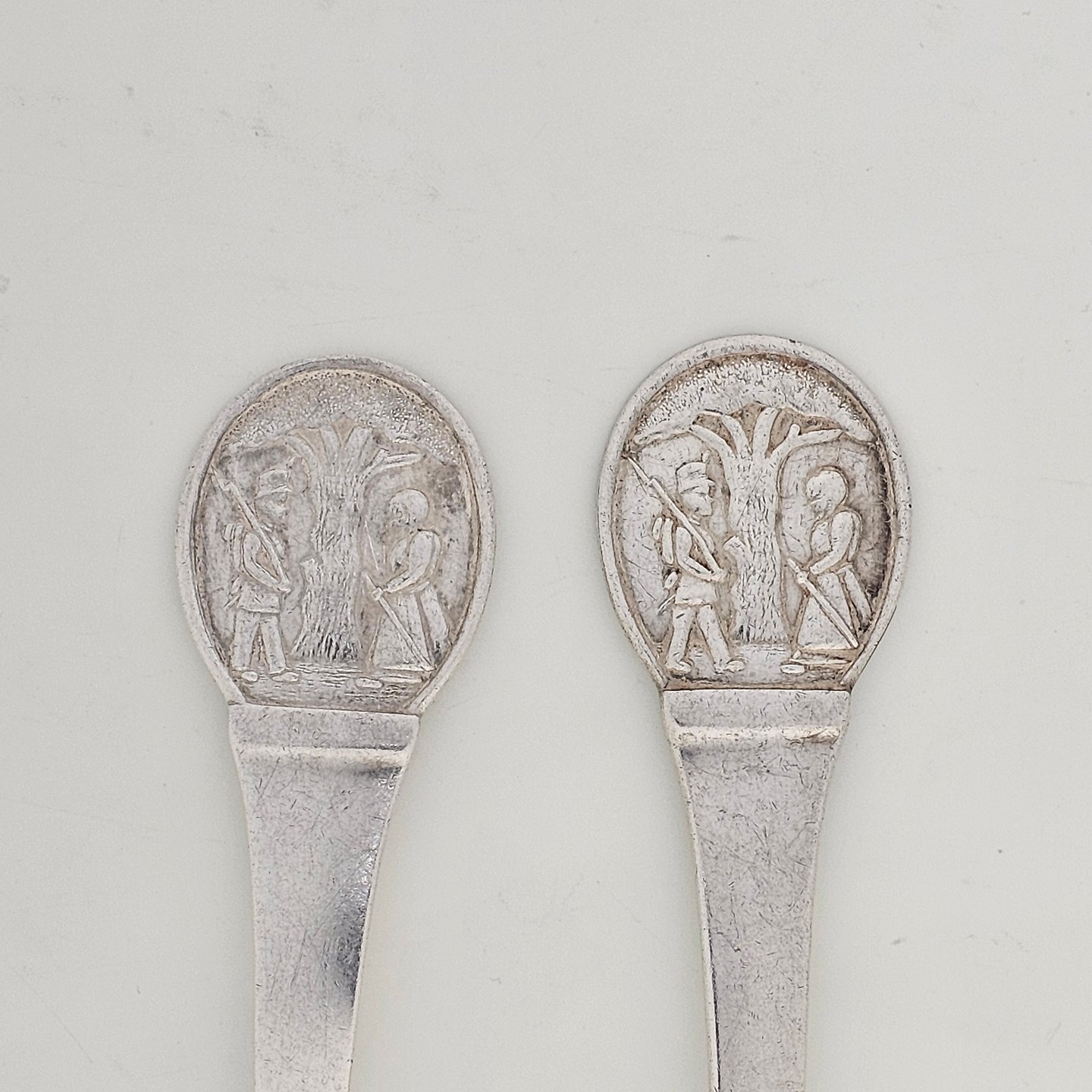 Gaffel og ske af pletsølv med motiv af H.C. Andersens Fyrtøjet