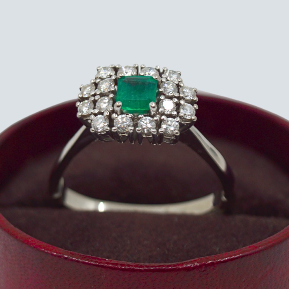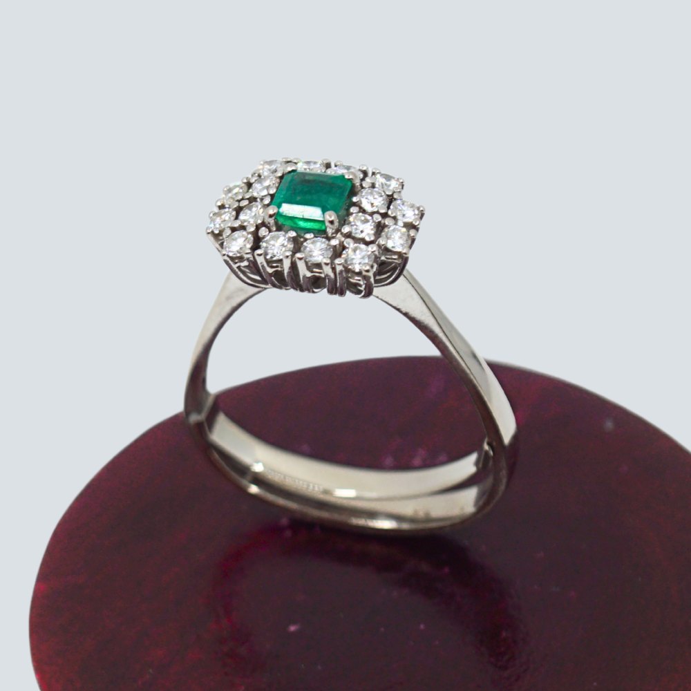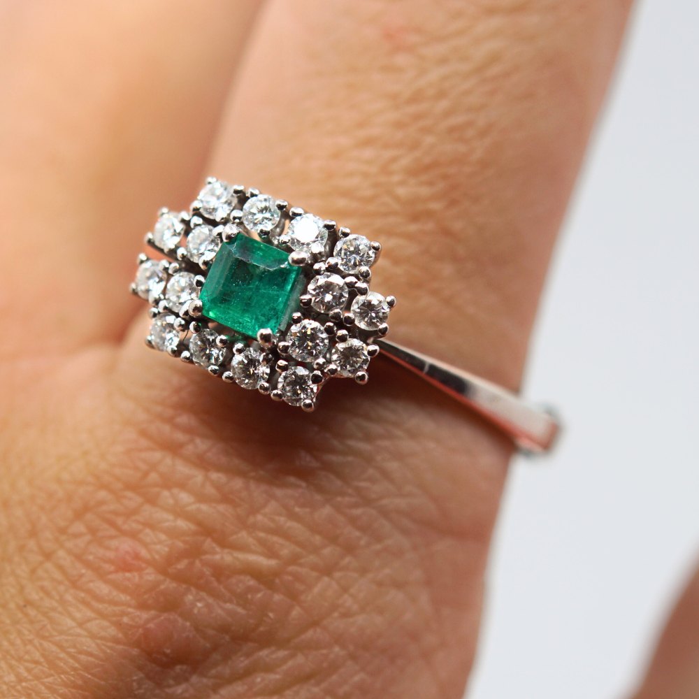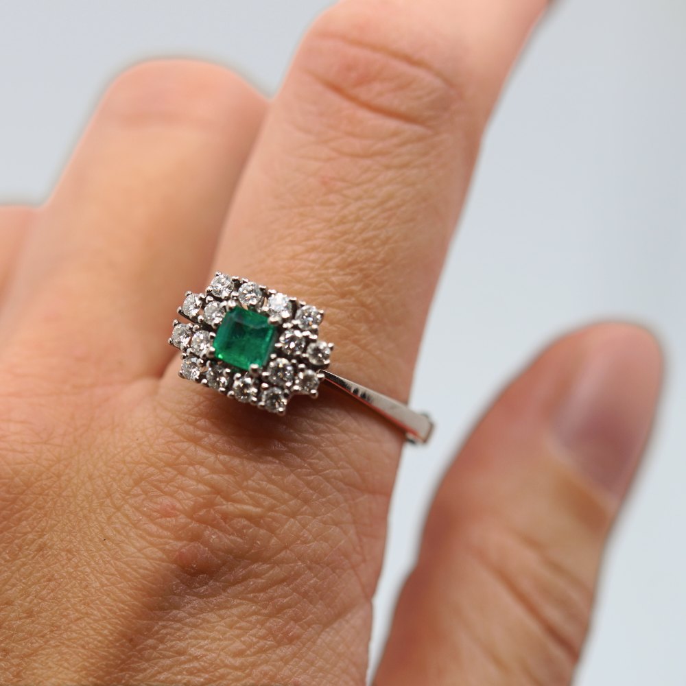 Carl Antonsen; Ring i 14 kt. hvidguld, prydet med diamanter og smaragd. Omkring ring str. 61. Med aftagelig skinne, som gør ringens størrelse mere fleksibel.