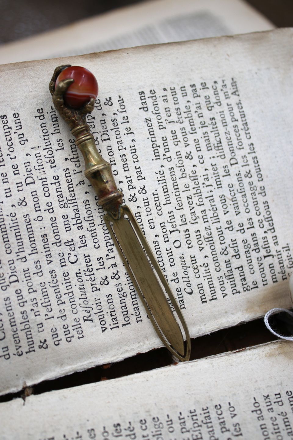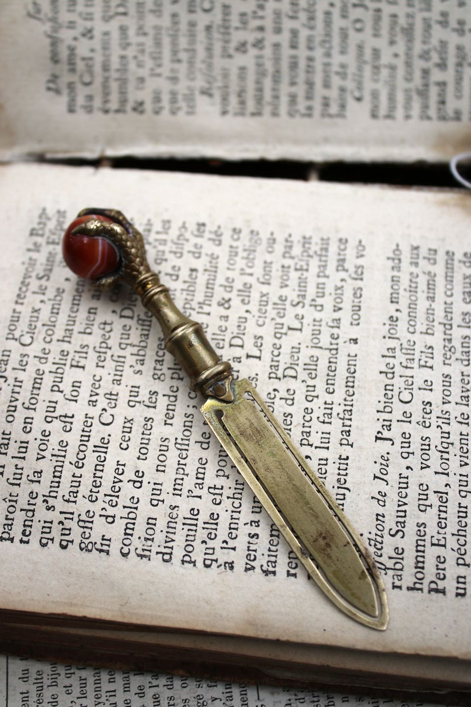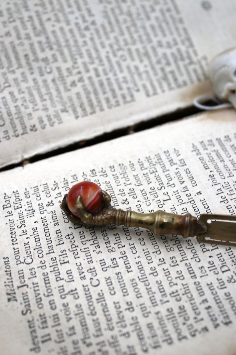 Antikt 1800 tals bogmærke i messing med ørneklo der griber om en marmor kugle. Længde: 10cm.Emne nummer: 1800 tals bogmærke