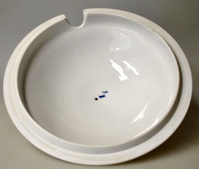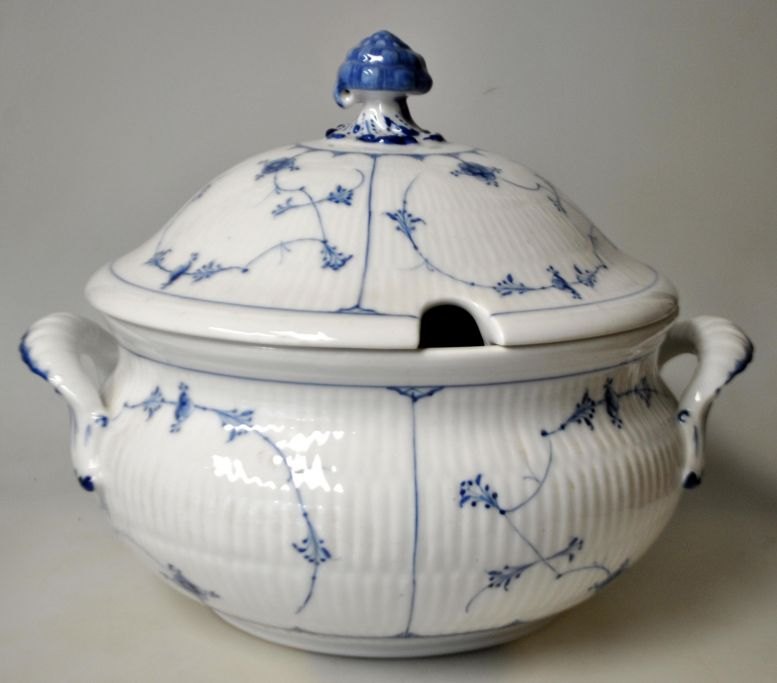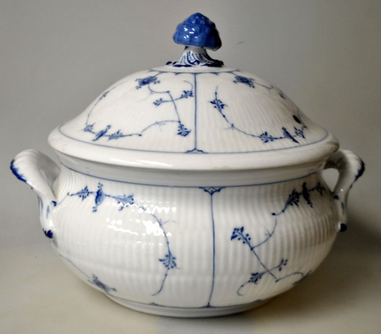 Royal Copenhagen rund terrin, no. 2, musselmalet, riflet,1850 - 1875, København, Danmark. Med låg. Stemplet. H.: 24 cm. Dia.: 24 cm.NB: Terrinlåget har en lille brun brændingsplet og indvendigt er der et lille afslag på lågkanten.