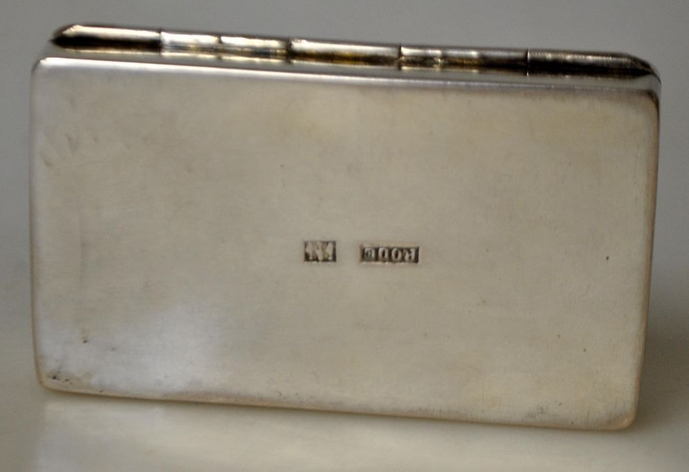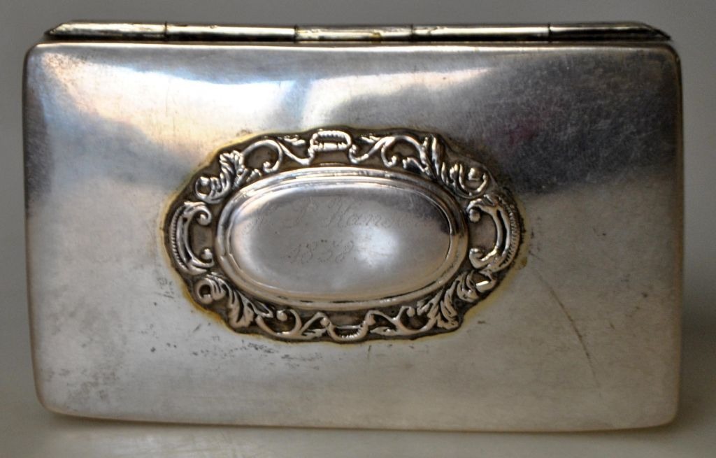 Carl Christopher Rode (1826 - 1902) Åbenrå, Danmark: Lugtedåse i sølv. Stemplet med mestermærke og byvåben. Indvendig lueforgyldt og gitter med agern og egeløv. 7,5 x 4,5 x 1,5 cm. Vægt: 68 gram.På låg indgravering: H. P. Hansen 1858.