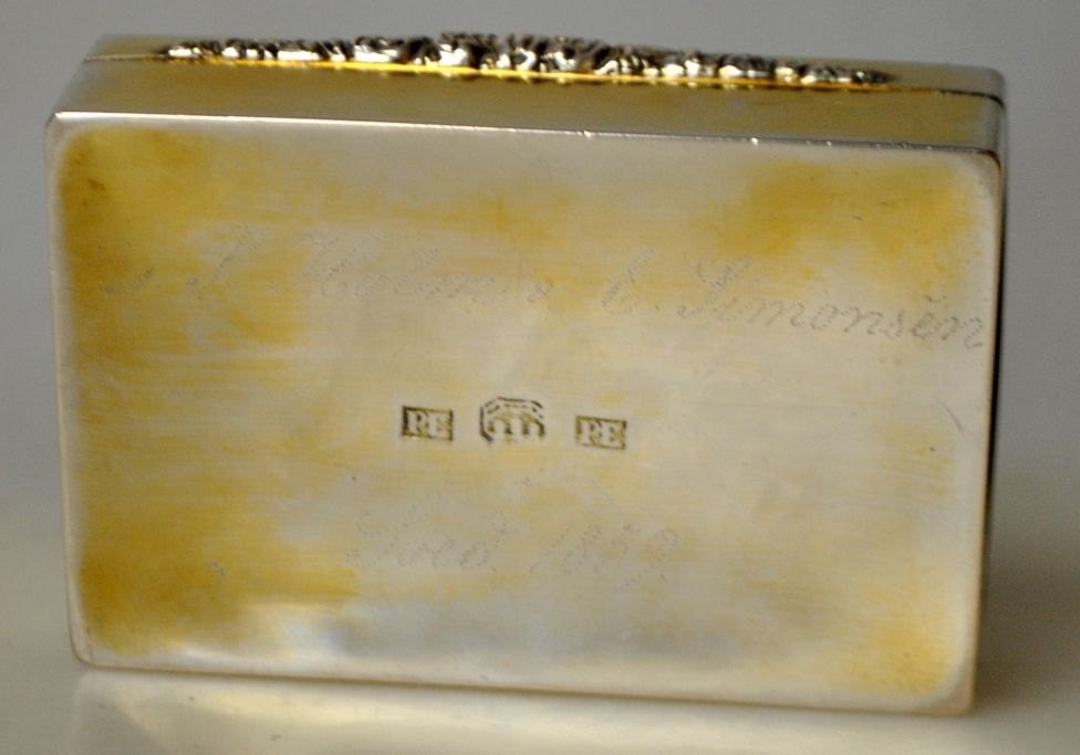 Peter Erichsen (1826 - 1869) Haderslev, Denmark: Silver centbox. Stamped with master's mark and city coat of arms. Inside gilded and lattice with rococo patterns with jumping deer, house and trees. 6.5 x 4.5 x 1.8 cm. Weight: 54 grams.Under bottom engraving: JP Holm and E. Simonsen.