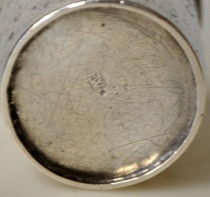 Erik Andersen Winther (1661 - 1725) Sølvsmed i Århus, Danmark: Barokt bæger med indgraveringer: P, N. S. B - A.N.D 1704. Punslet. Stemplet med mestermærke. H.: 6 cm.Med senere indgravering: Christian Gjern 1917.