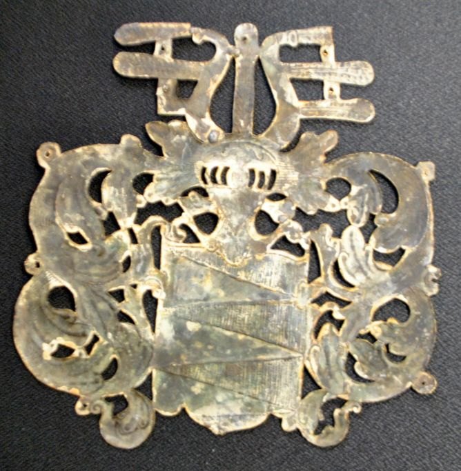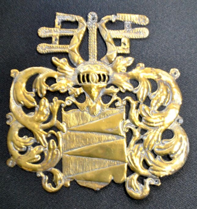 Messingskjold med adelsvåben, 17.-18. årh. Barok. Danmark. 21,4 x 20,5 cm. Til montering.Del af fjer mangler foroven.