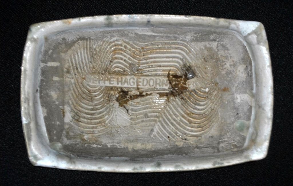 Hagedorn-Olsen, Jeppe (1929 - 2011) Danmark: Fad. Glaseret lertøj. Glasur i hvidt, blåt og sort. Signeret. 13,5 x 21,5 cm.Emne nummer: 28641