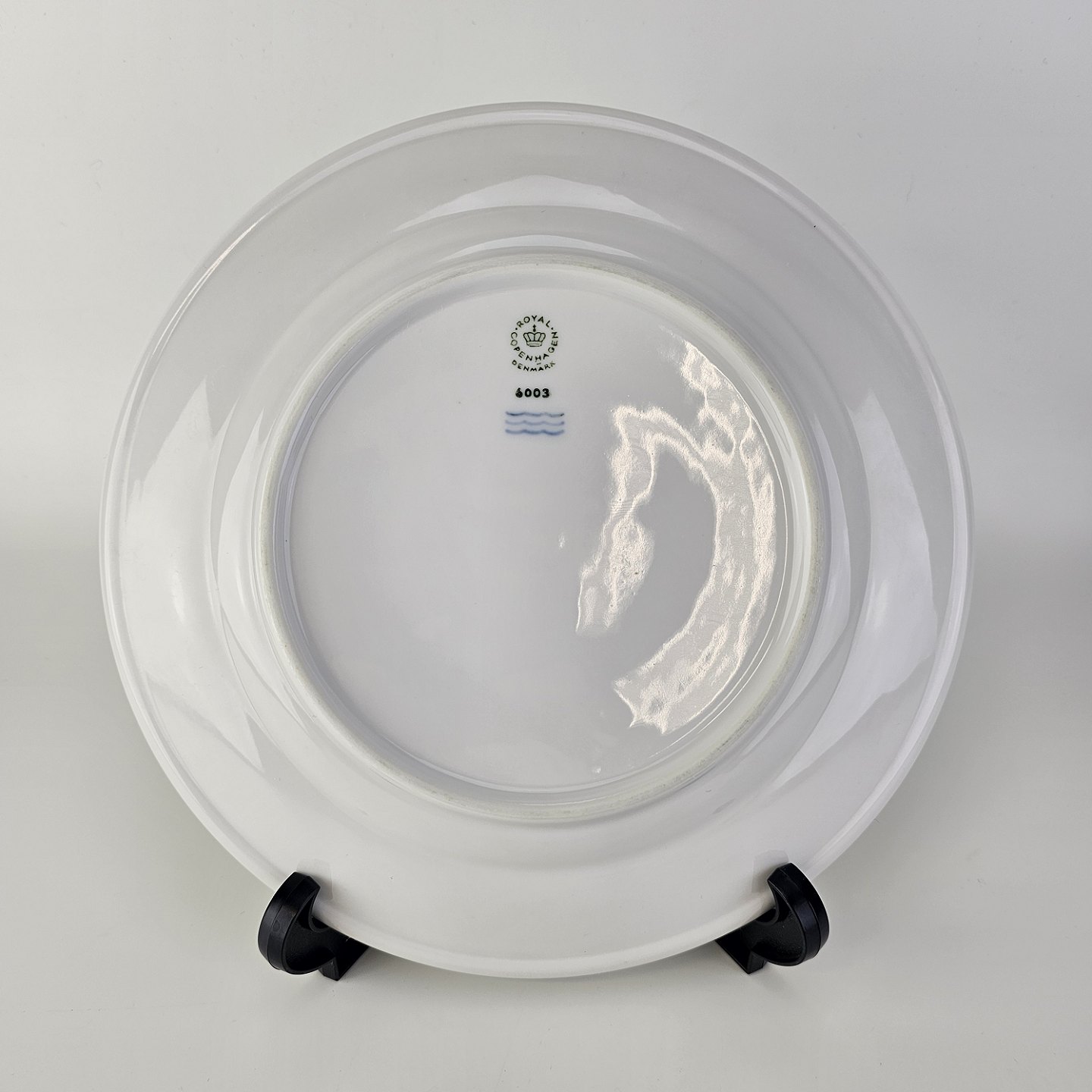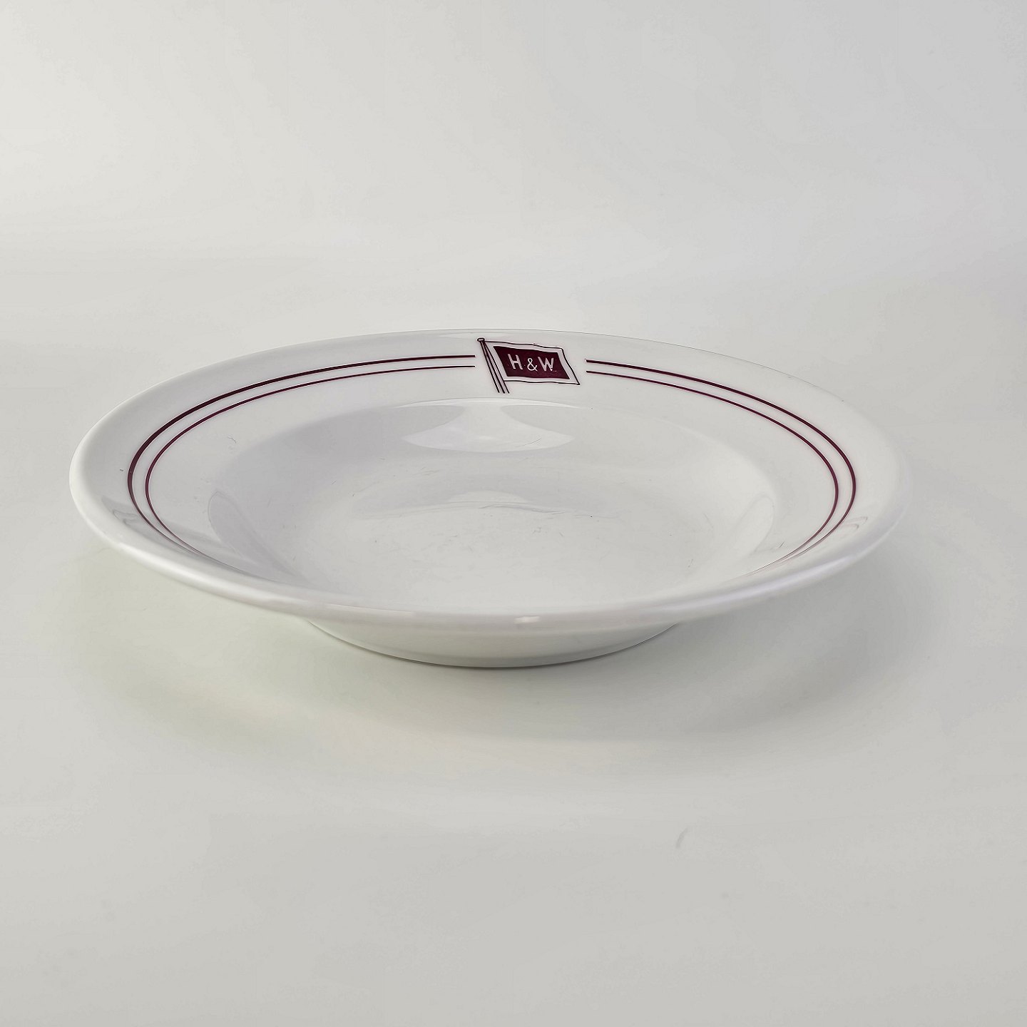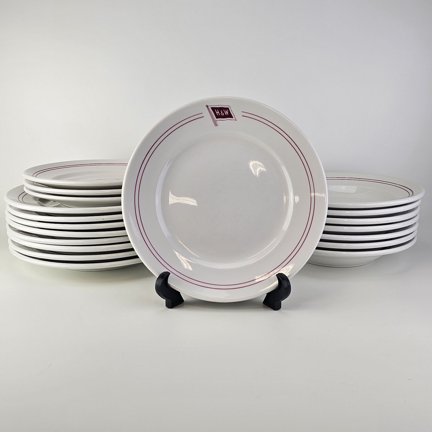 Sæt hotelporcelæn af flade middagstallerkener, flade frokosttallerkener og dybe tallerkener i kongeligt porcelæn dekoreret med røde streger og logoet for Holm & Wonsilds rederiProducent Royal Copenhagen
