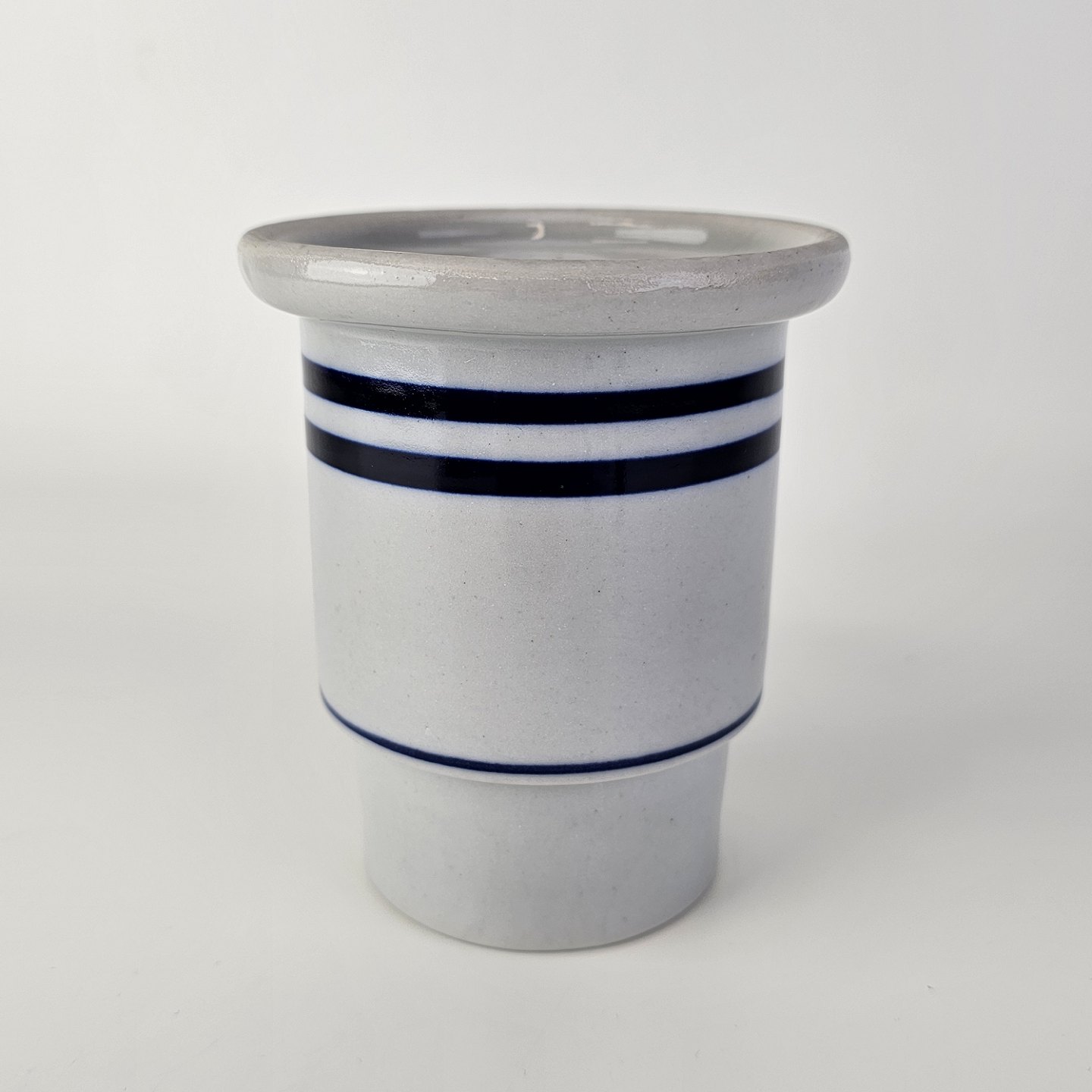 Krukke i glaseret stentøj med dekoration af tre blå striberFormgiver Niels Refsgaard