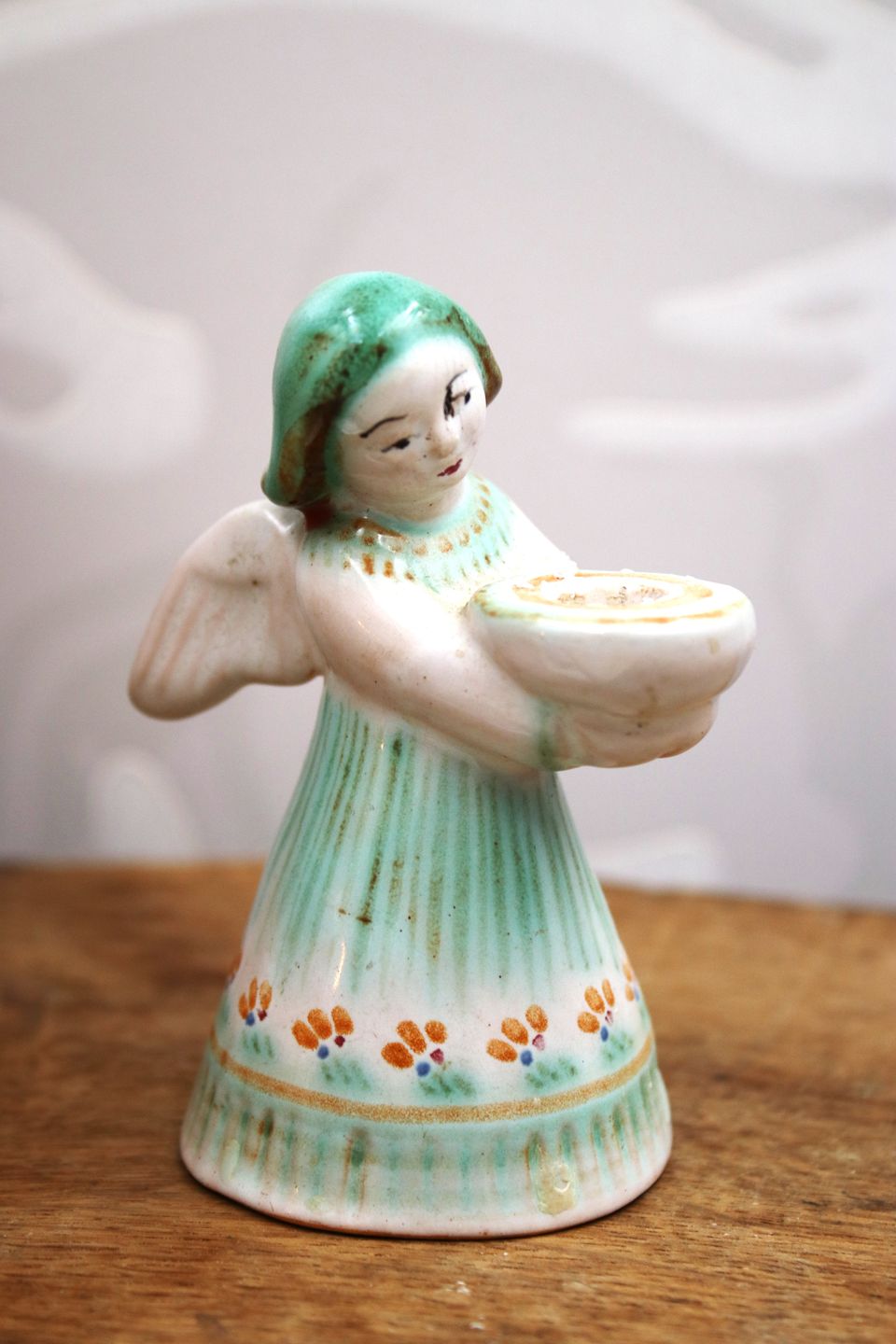L. Hjorth keramik engel med sjælden grøn glasurder holder et lille stearinlys. Højde: 9cm.