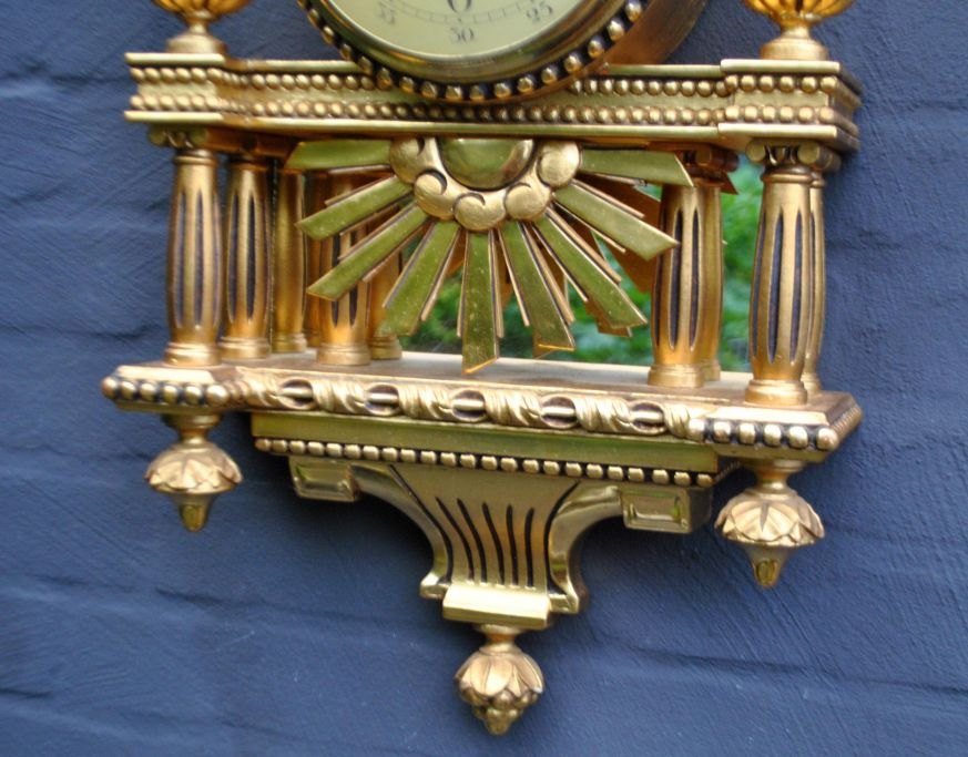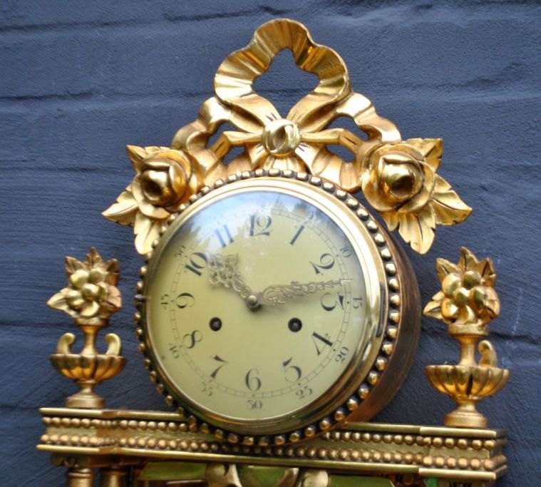 Svensk forgyldt vægur, 20. årh. H.: 60 cm. B.: 34 cm. Skive med arabertal.Emne nummer: 28475