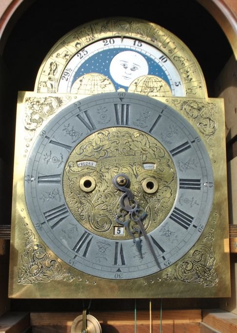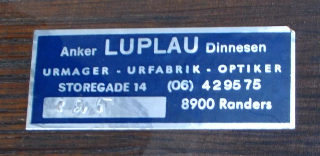 Dansk standur, 20. årh. Urfabrikant og urmager Anker Luplau Dinesen, Randers. No.: 325. Standur i mahogni med urhus med kvartsøjler. Urværk med månefase og kalender med måneder og dato. Med timeviser. Skiv i messing med romertal. H.: 210 cm. B.: 44 cm. D.: 24 cm.Perfekt stand!