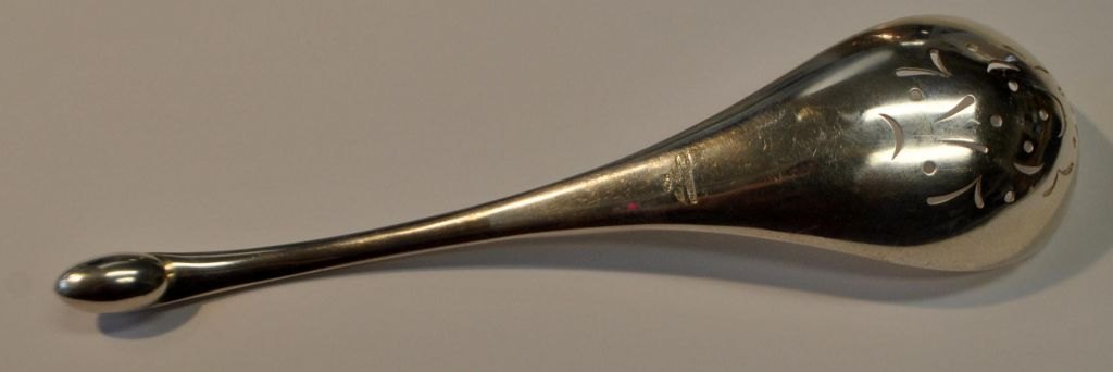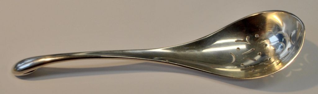 Hans Hansen sterling is ske, 20. årh. Kolding, Danmark. Med huldekorationer i laf. Stemplet: Hans Hansen 925 sterling Denmark. L. 17,5 cm. Vægt: 64 gram.Perfekt stand!