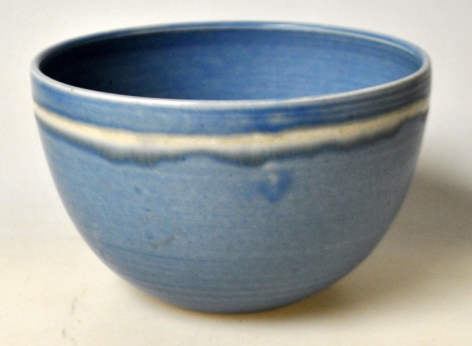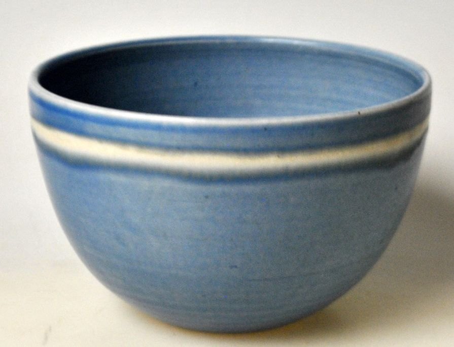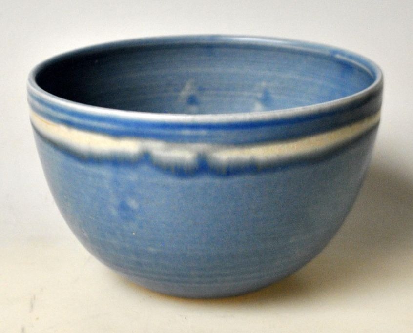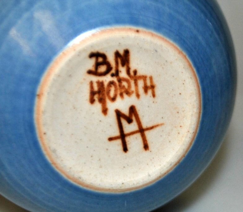 Hjorths keramik, 20. årh. Bornholm, Danmark. Unika skål. Stentøj. Med dekoration på siderne. Gårblå glasur. Stemplet: B.M., Hjorth og monogram M.. H.: 8 cm.Emne nummer: 28659