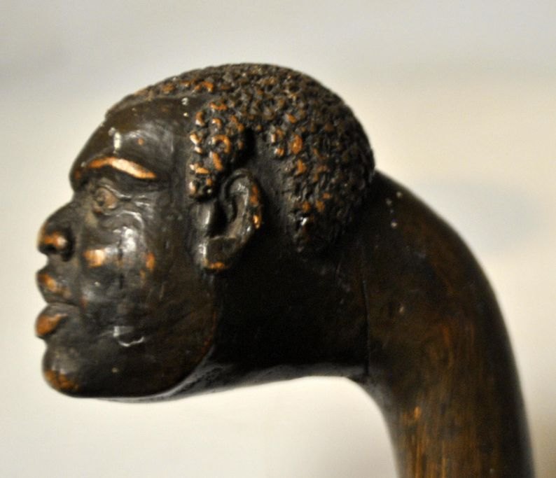 Spadsererstok i træ med udskåret ansigt, 19. årh.