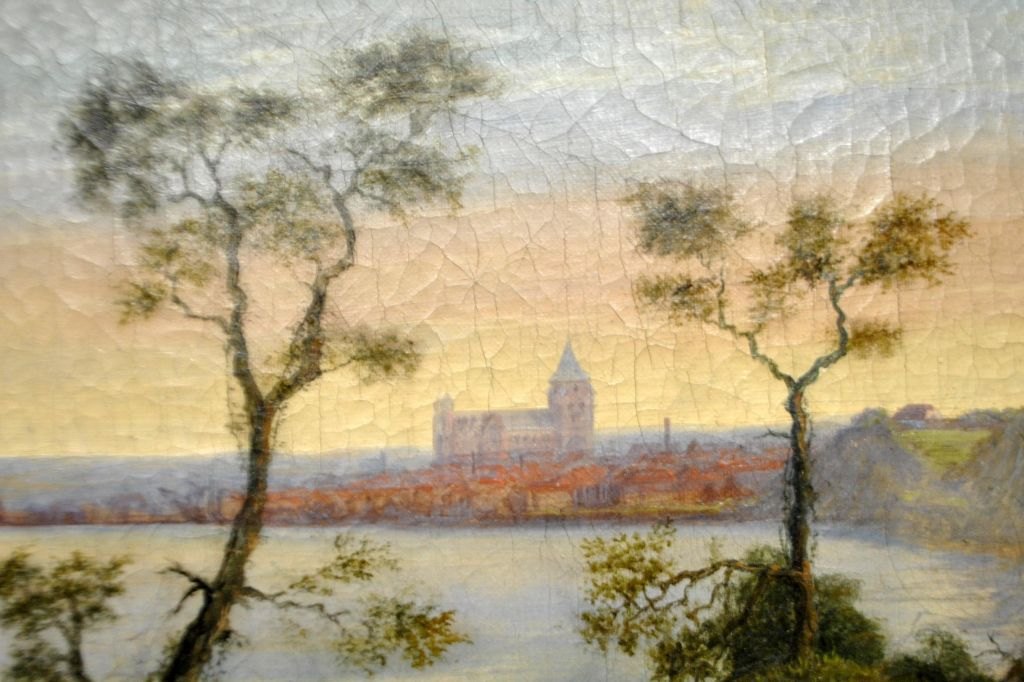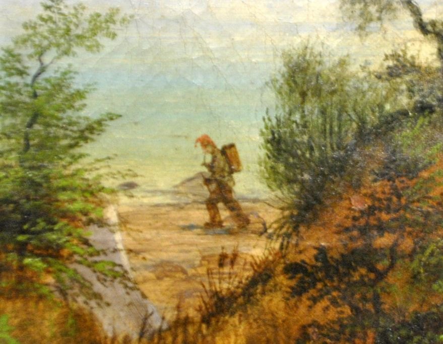 Holm, Peter (1798 - 1875) Danmark: Udsigt over Aarhus bugten mod Aarhus med Domkirken. Udsigt fra Risskov. I forgrunden ses en vandrer. Usigneret. 40 x 55 cm.Uindrammet.