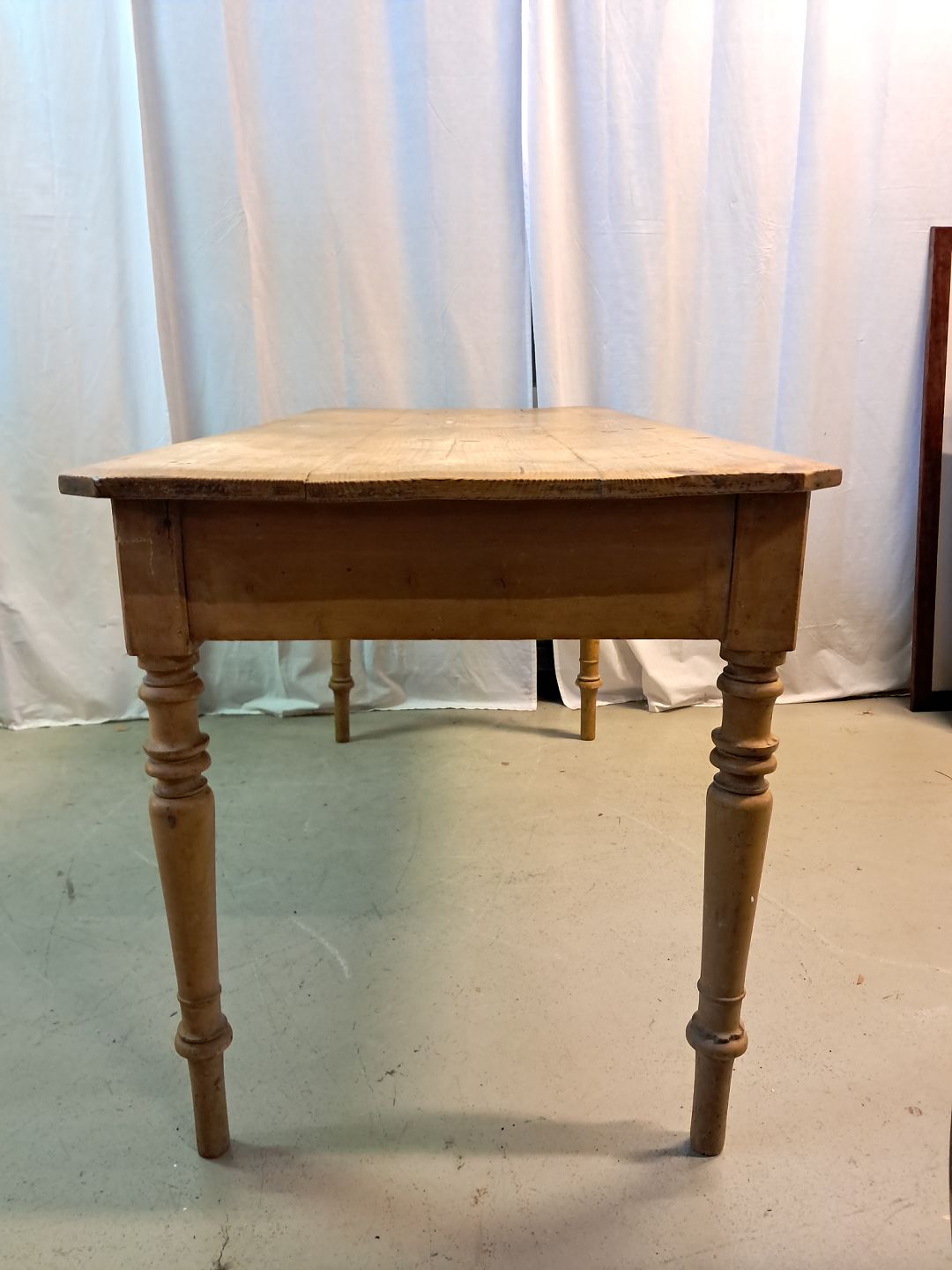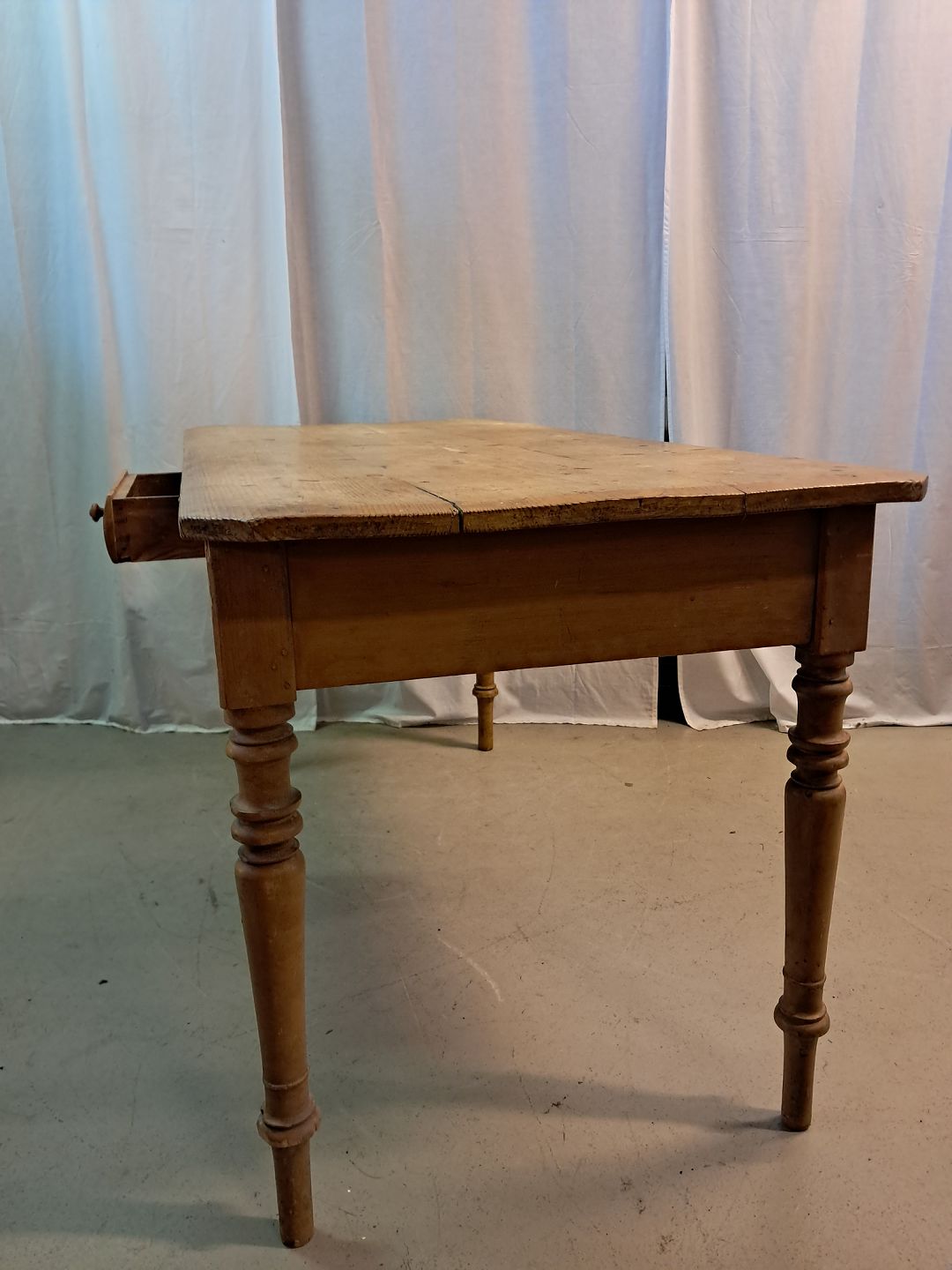 Bord med skuffe i massivt fyrretræ, fra 1910erne.Det har brugsspor.