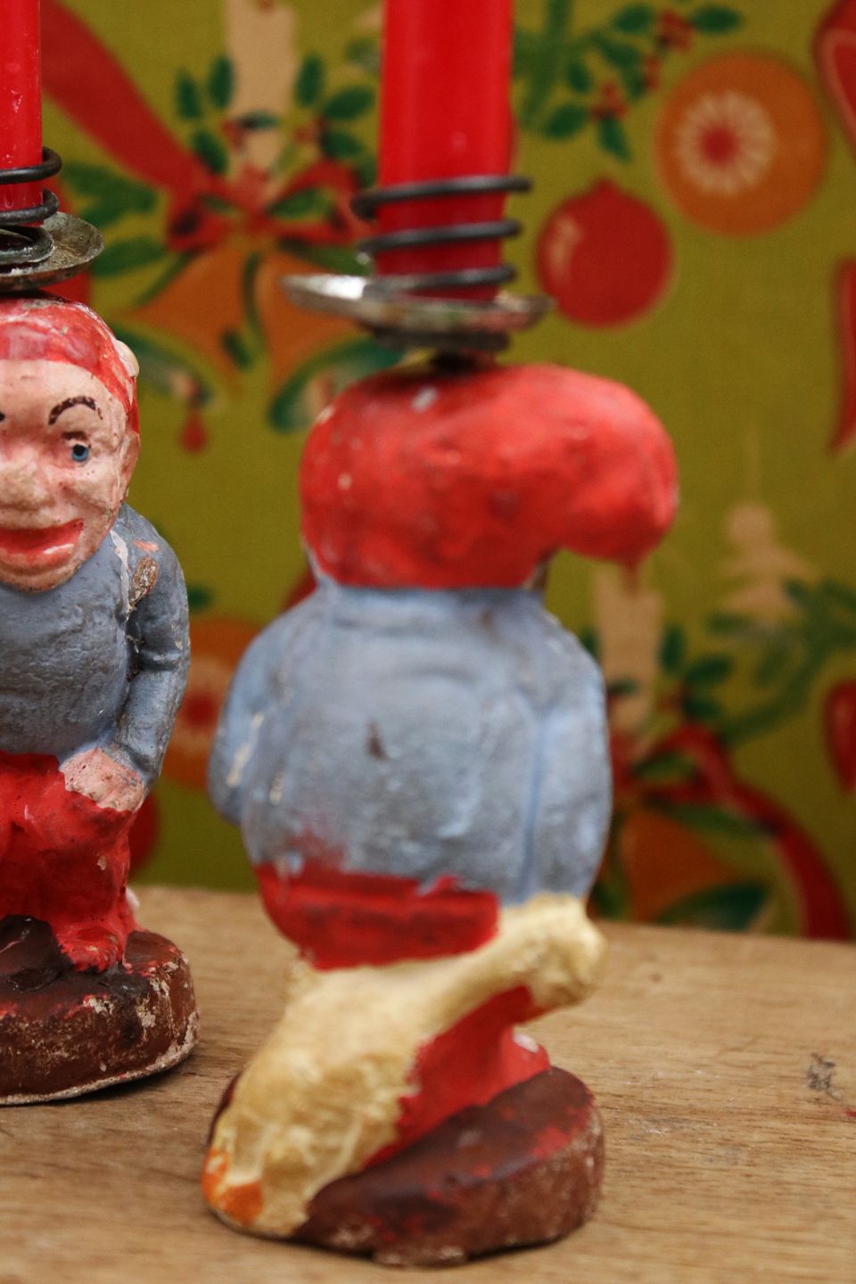 Søde små julenisser med gås på ryggen i bemalet gips med lysholder i toppen til et lille julestearinlys. Højde: 10,5cm.(3 stk. haves på lager)