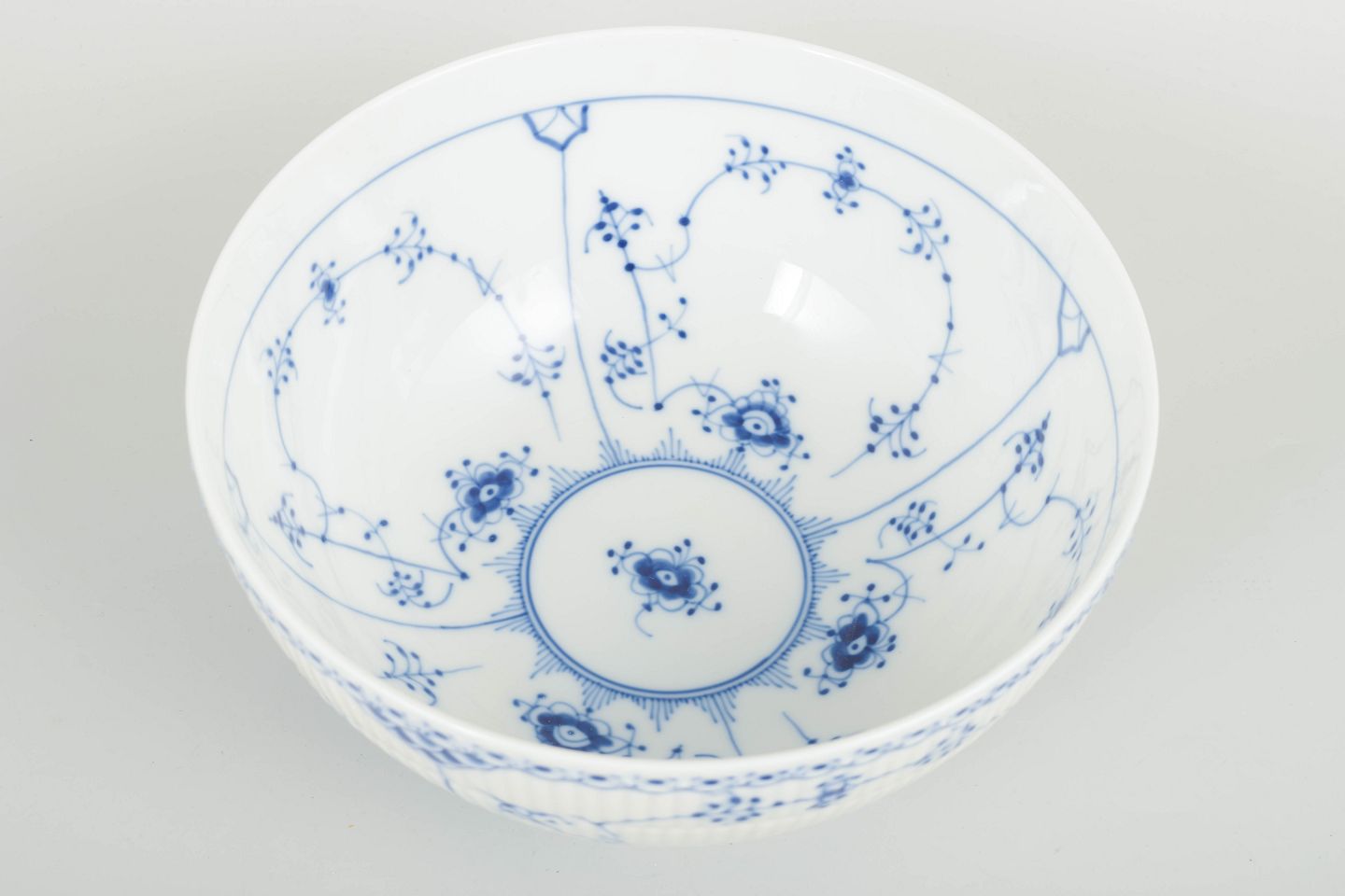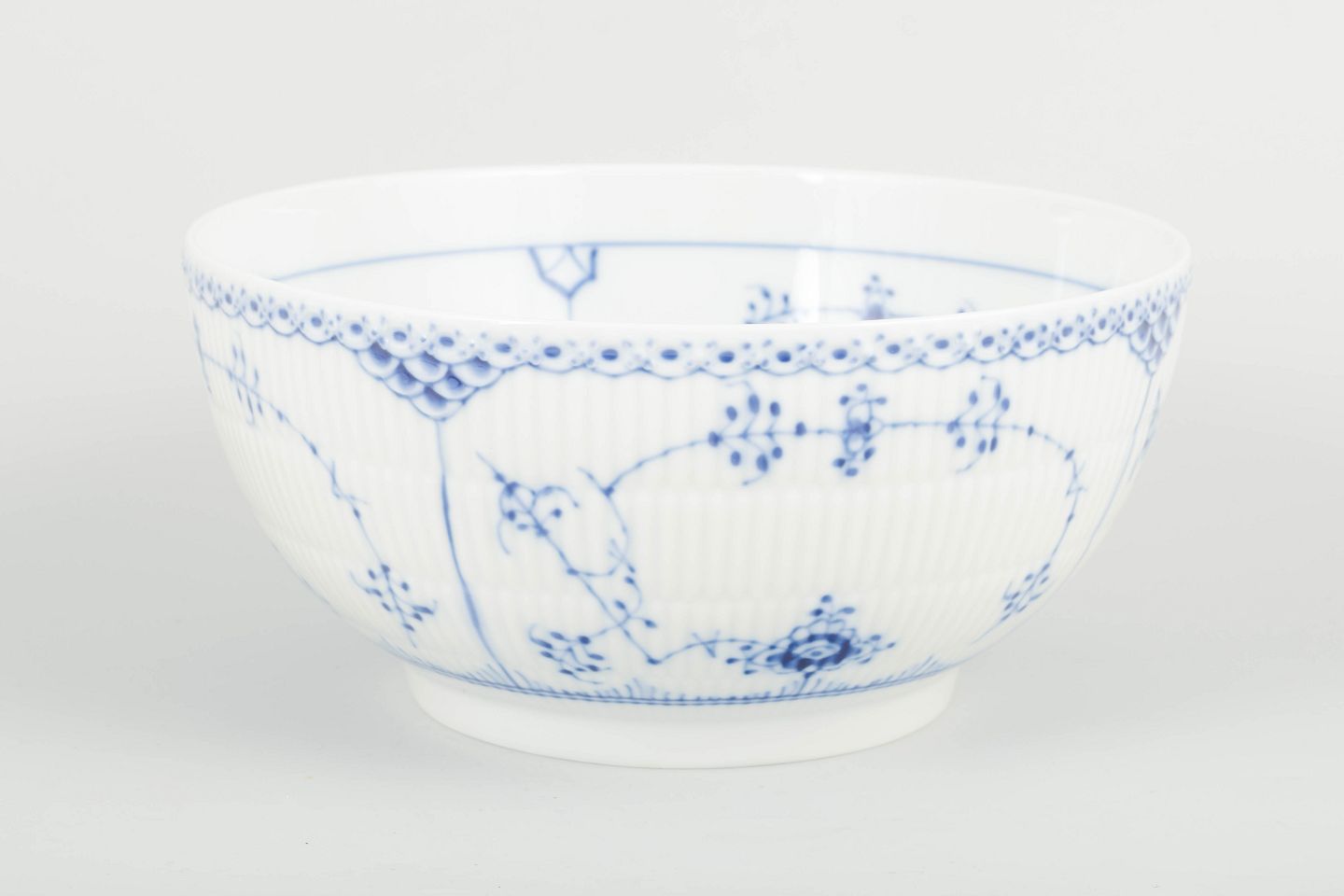 Stor og dekorativ salatskål i musselmalet halvblonde. Udført i riflet porcelæn med håndmalet koboltblå dekoration og den karakteristiske blondekant langs randen. En rummelig og funktionel skål i klassisk Royal Copenhagen-kvalitet.