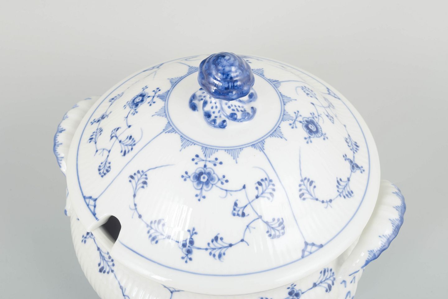 Stor og kraftfuld suppeterrin i musselmalet riflet porcelæn, smukt håndmalet i koboltblå på riflet korpus. Terrinen har markante sidehåndtag, generøs volumen og et låg med dekorativ knop.