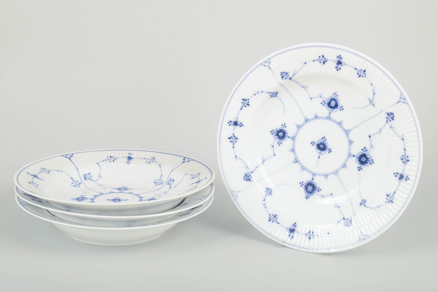 Sæt á fire dybe tallerkener i klassisk musselmalet porcelæn med håndmalet blå dekoration og riflet korpus.