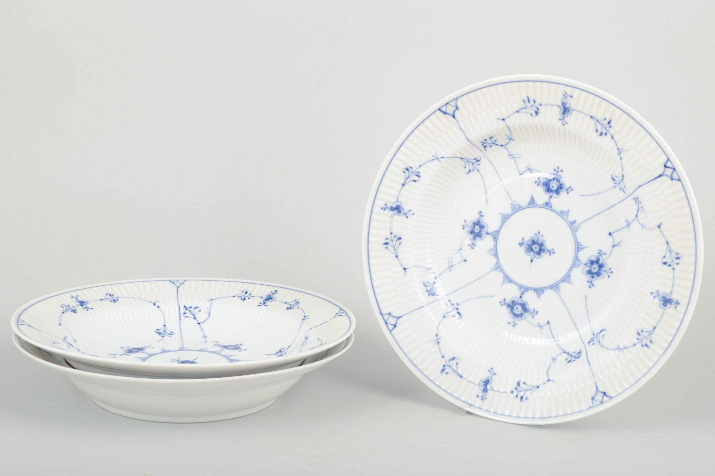 Sæt á tre dybe tallerkener i klassisk Musselmalet porcelæn med håndmalet blå dekoration og riflet korpus. Elegant og tidstypisk udførelse fra begyndelsen af det 20. århundrede.