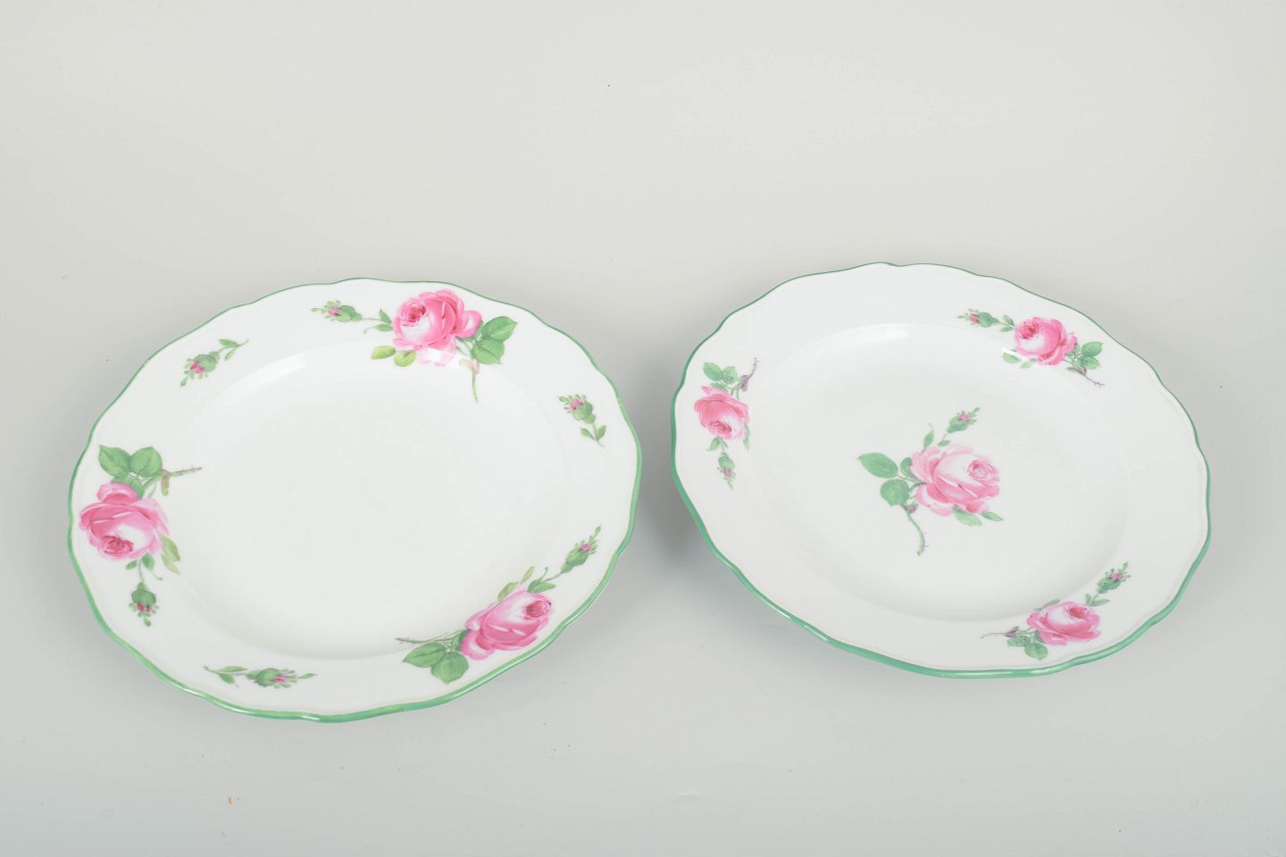 Meissen to middagstallerkener, 1930’erne.Smukke tallerkener i hvidt porcelæn med håndmalede lyserøde roser og grøn bort langs den svungne kant. Klassisk Meissen-kvalitet og elegant dekoration i tidstypisk 1930’er-stil.
