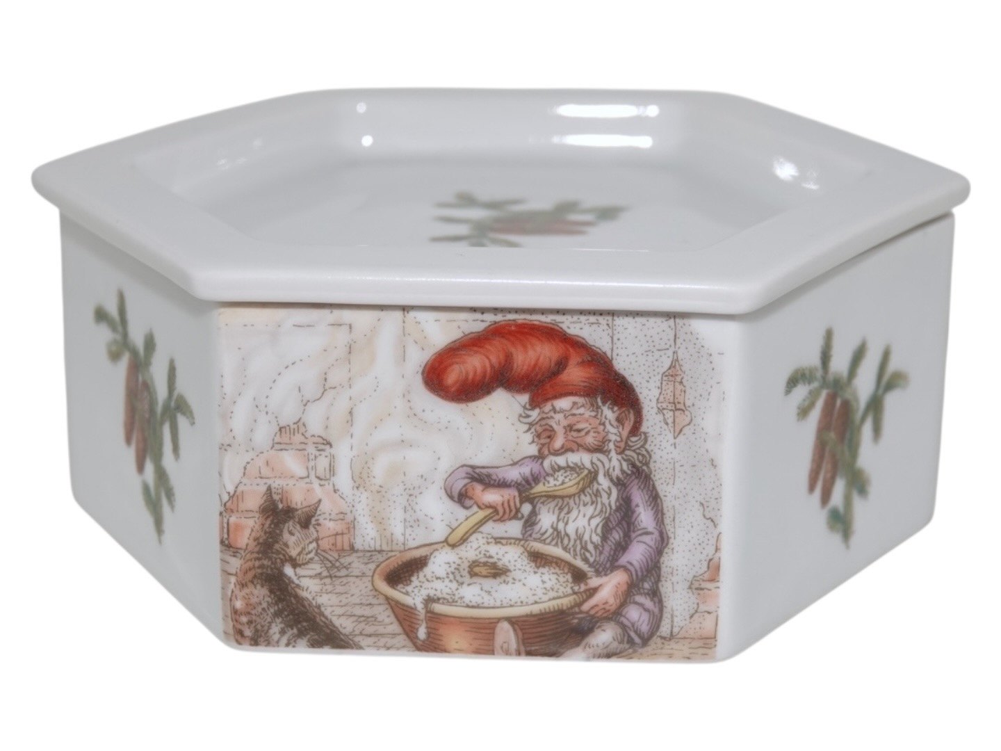 Bing & Grøndahl, sekskantet skål med låg dekoreret med nisser.Af fabriksmærket kan det udledes, at denne er produceret mellem 1970 og 1983.